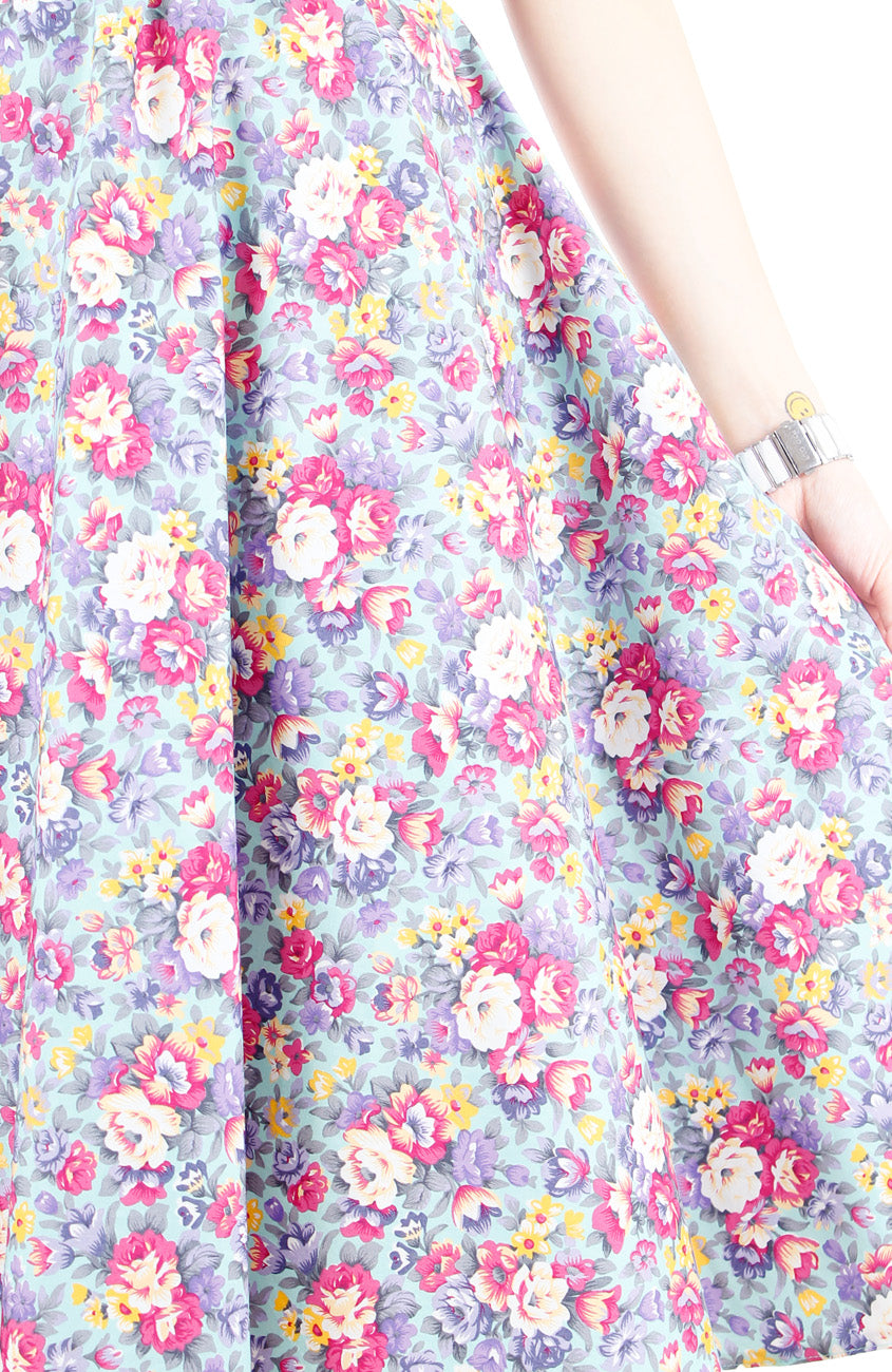 Whether you decide on scones and clotted cream or waffles with maple syrup at the hotel’s garden café, you already made a stylish choice with this gorgeous floral dress! Boasting pink, white and yellow blooms on a pastel turquoise background, this dress is as beautiful as the décor that surround you. Details include: Double layered top, flare skirt with inner lining, side pockets and a hidden back zip. Made from cotton.