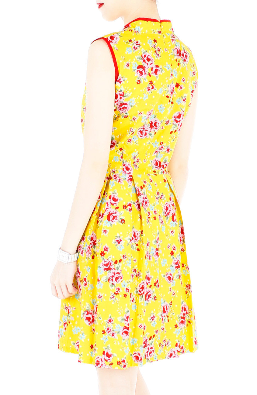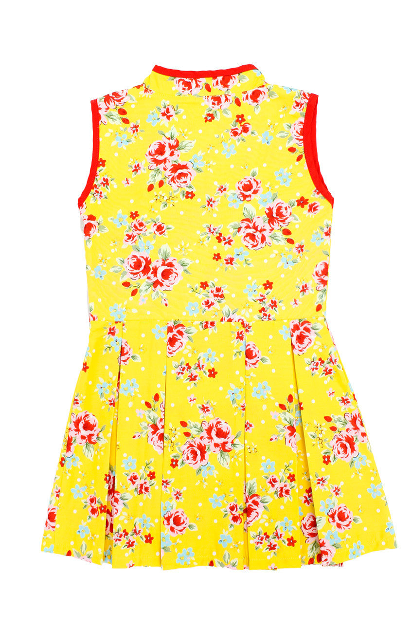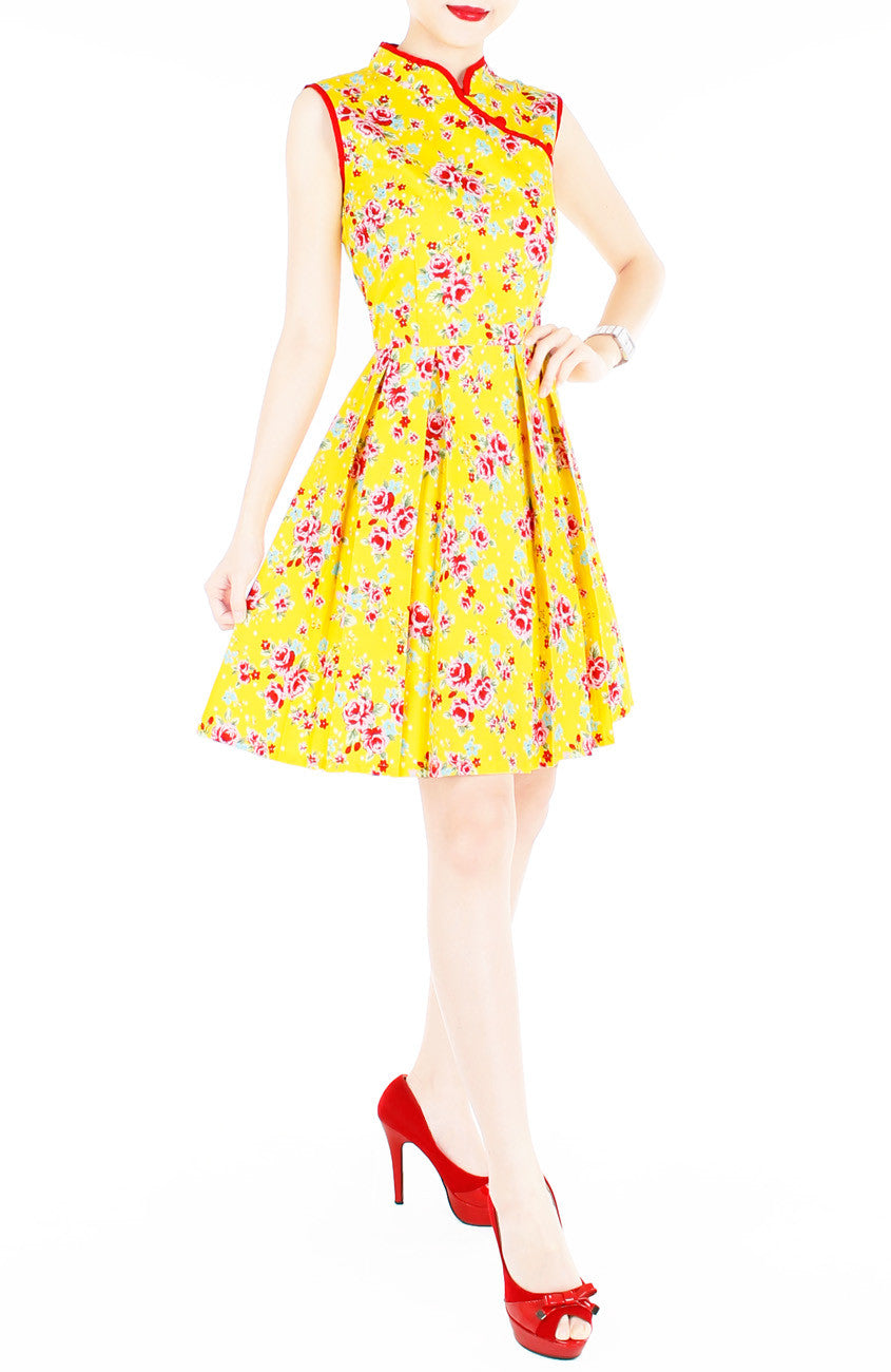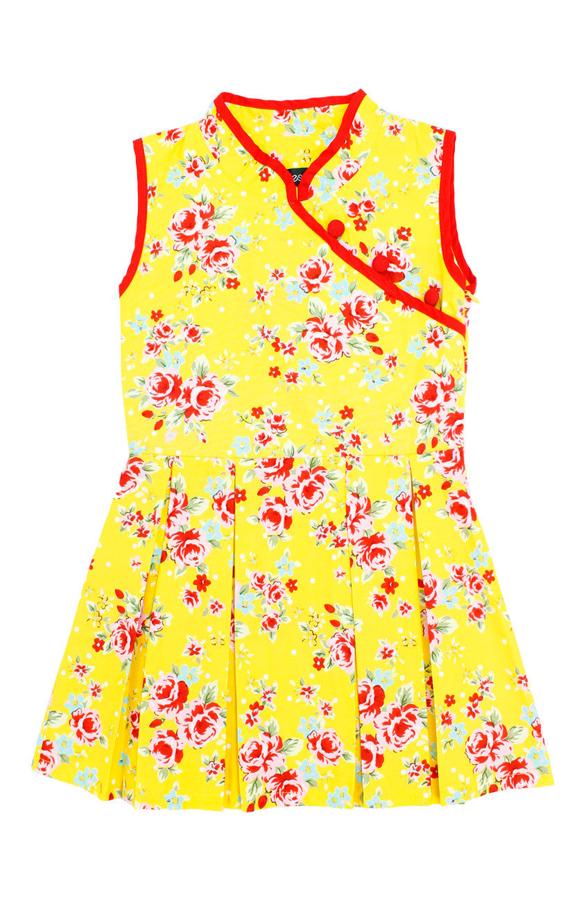 cYour bright and poised attitude is adored the world over, and once you flaunt it alongside this happy yellow dress with red florals, you’ll be just as revered as your style! High neck Mandarin collars, buttons (non-functioning), double layered top, flare skirt with inner polyester lining and a hidden back zip. Made from 100% cotton, breathable & perfect for the hot & humid New Year weather. Machine-washable (colour does not bleed). Matching kids dress is available.