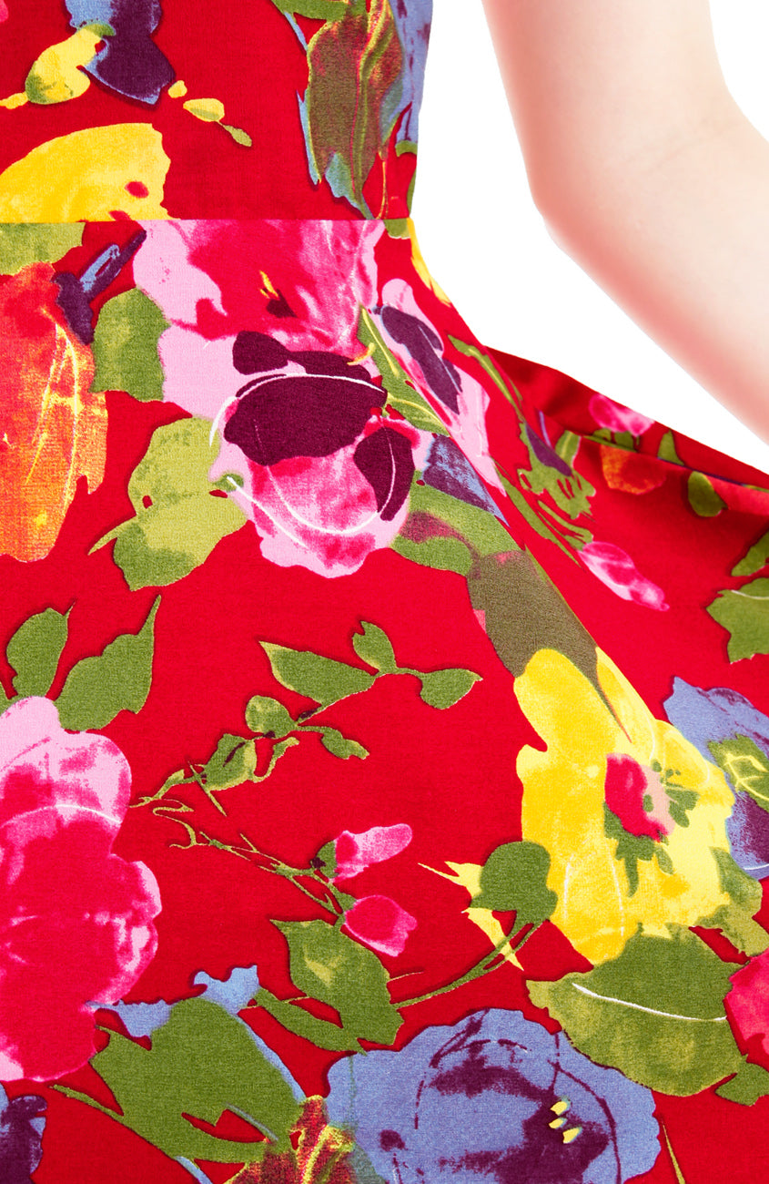 Glide effortlessly into the heart of elegance by donning this to the latest art gallery opening in town. With a display of abstract blooms in yellow, blue, pink and orange in a red background, this dress from our label is the portrait of panache! Details include: Double layered top, flare skirt with inner lining, side pockets and a concealed back zip. Made from cotton.