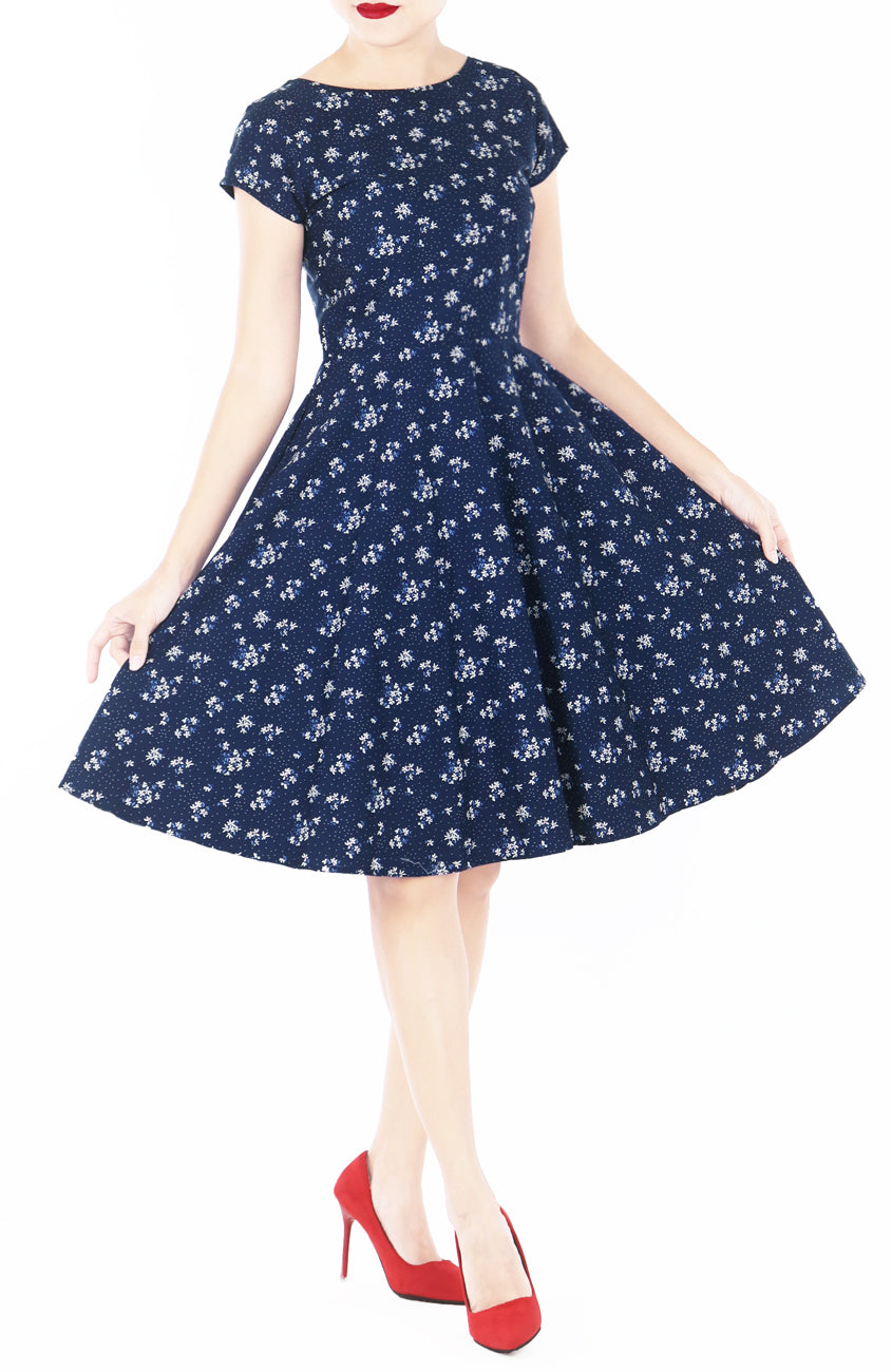 A classic navy blue tea dress sprinkled with adorable white florals - perfect for making a lasting impression! Dance through the night confidently, as your date will not forget you in this lovely flared piece.