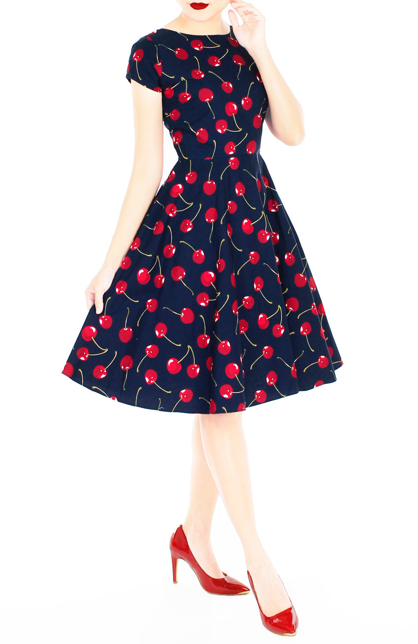 Ch-ch-cherry bomb! A vintage-inspired dress get a cherry pick-me-up thanks to an all over cherry red print on a navy back. This dress will guarantee envious second glances! Details include double-layered top, cap sleeves, nipped-in waist, flare skirt with inner lining and hidden side pockets and hidden back zip. Made from cotton – breathable & machine washable (no colour bleed). Hand wash for initial wash.
