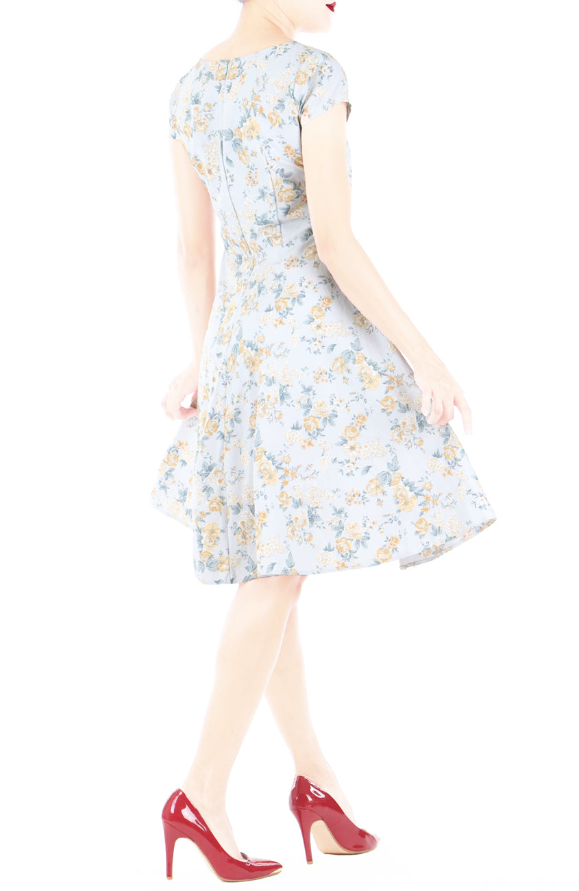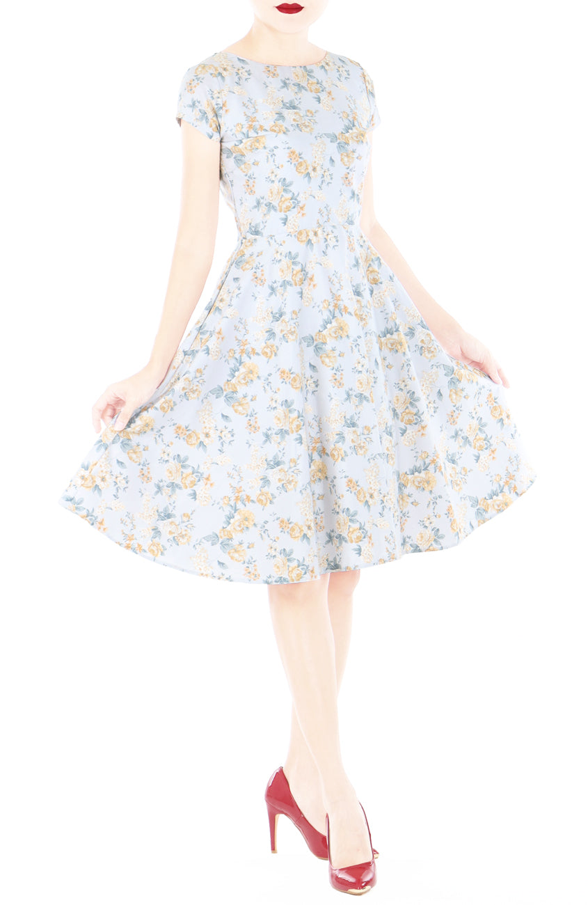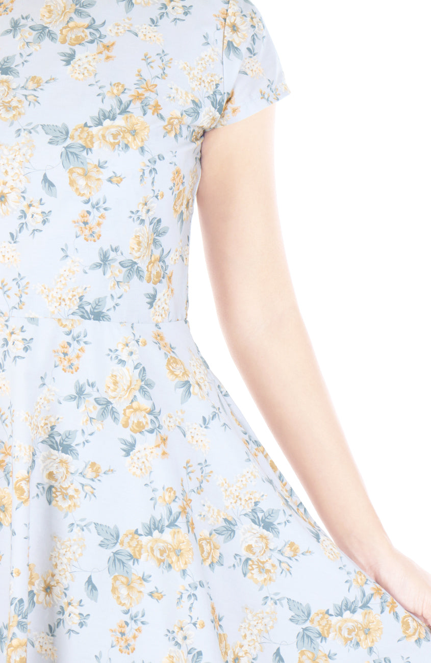 You’ll be stealing hearts in this light grey tea dress, covered in golden blooms! This flare dress delivers a romantic and elegant style you’re going to love.