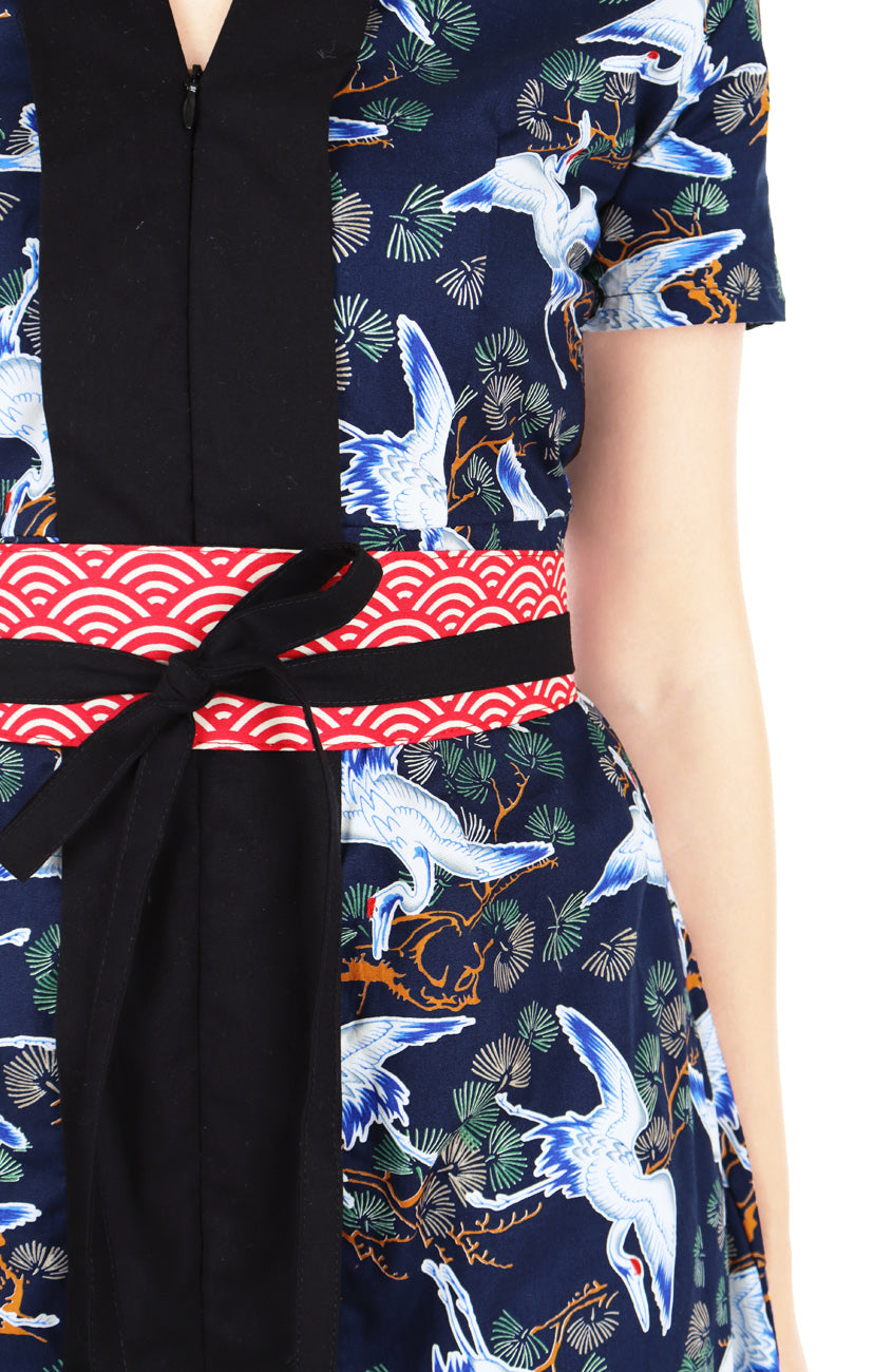 Rise to the festive occasion marvelously in this one-of-a-kind modern Nyonya kebaya dress with auspicious cranes and red seigaiha (Japanese wave pattern and symbol of good fortune). With a black kebaya lapel, this contemporary piece is the epitome of a head-turning design.