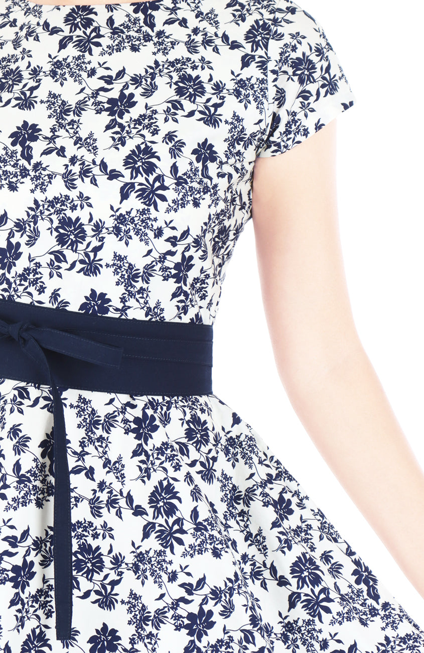 So delightfully graceful, you wear this tea dress, covered throughout with beautiful navy floral prints on an off-white background, to this weekend’s high tea with friends and family. Accompanying your elegant entrance is a flowy, flare skirt that will leave your loved ones blown away! Styled here with the Contemporary Obi Belt in Midnight Blue (sold separately).