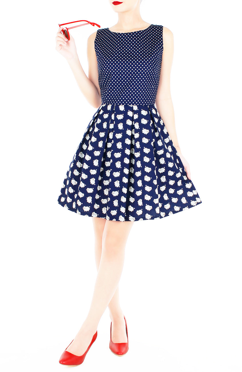 What could make your impromptu high tea session even better? A quirky match of polka dots and adorable sheep to don while you sip! This endearing flare dress is a must-have for any girly catch-up activity. Details include: Double layered top, pleated flare skit with inner lining, side pockets and a hidden back zip. Made from cotton.