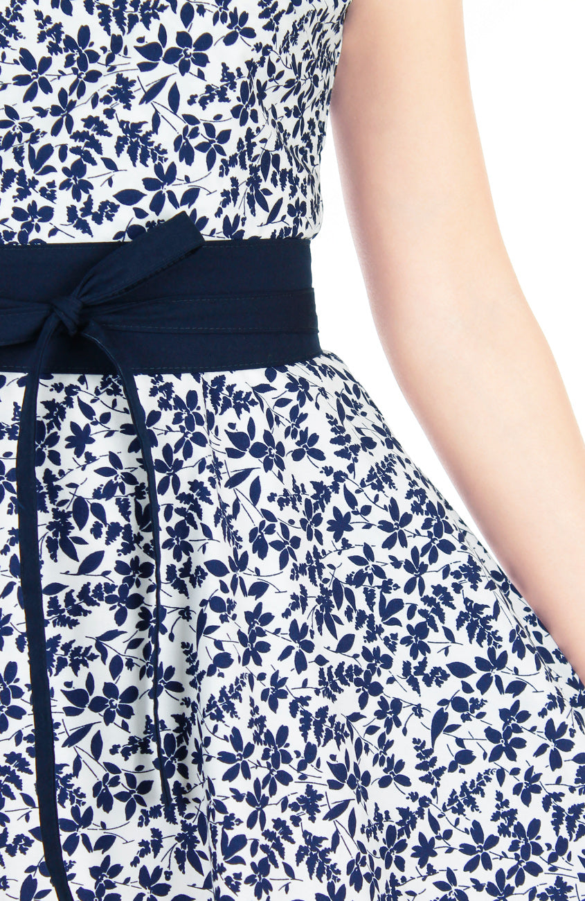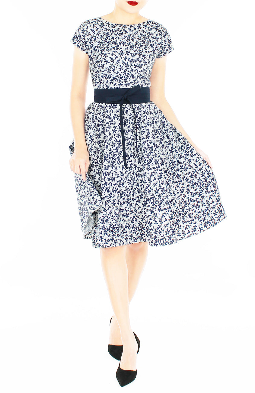 So romantic, this flare dress is a versatile piece to work in your wardrobe all-year round.  Featuring an overall print of illustrated ferns in midnight blue on an off-white background, this flare piece will have you feeling fluttery and free! Styled together with the Contemporary Obi Belt in Midnight Blue (sold separately).
