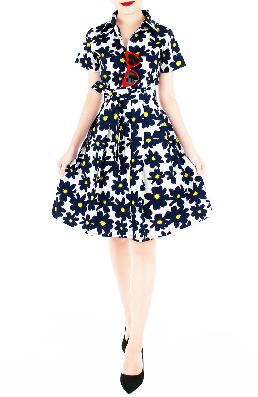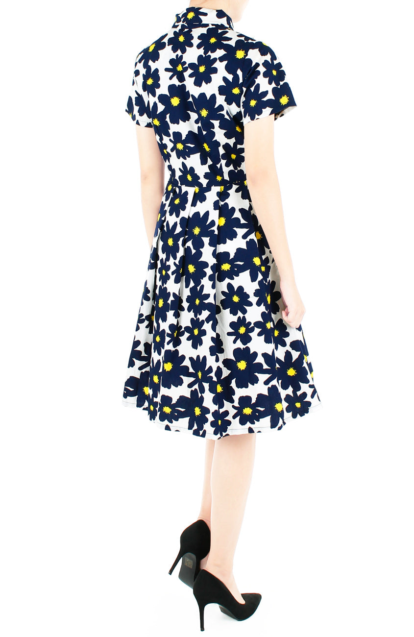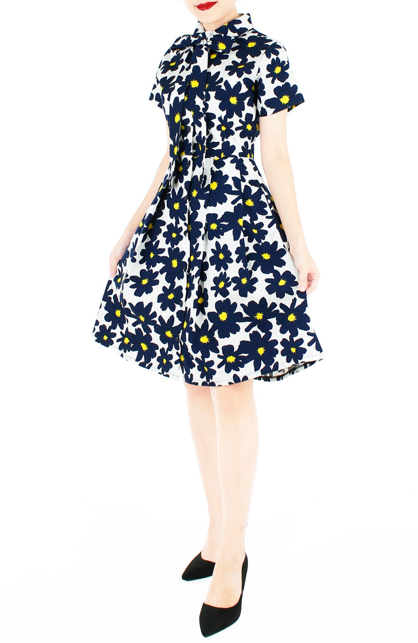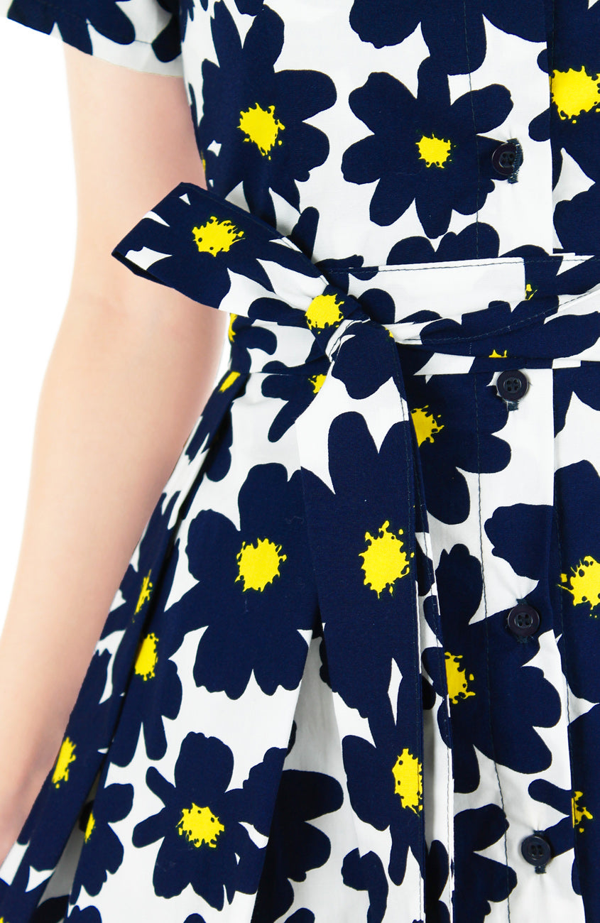 Maybe you have an upcoming date night, or a full blown jazz festival – either way, a special night out should be spent in this gorgeous white shirtdress with navy and yellow floral print! You can wear this two ways – with the pussy-bow on your neck, or as a waist sash. Details include: Crisp collars, hidden side pockets, short sleeves, double layered top, pleated flare skirt with inner lining. Made from cotton – breathable & machine washable (no colour bleed). Hand wash for initial wash.