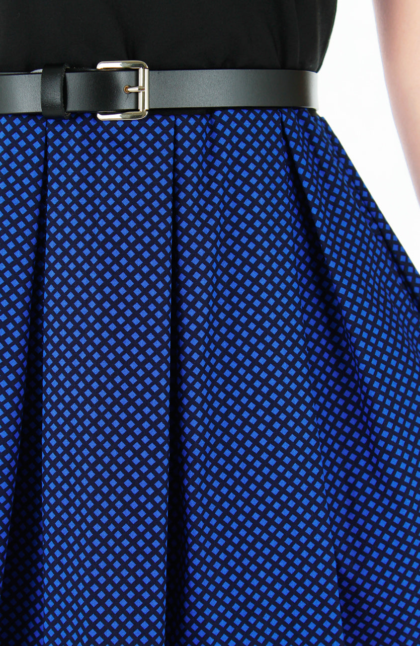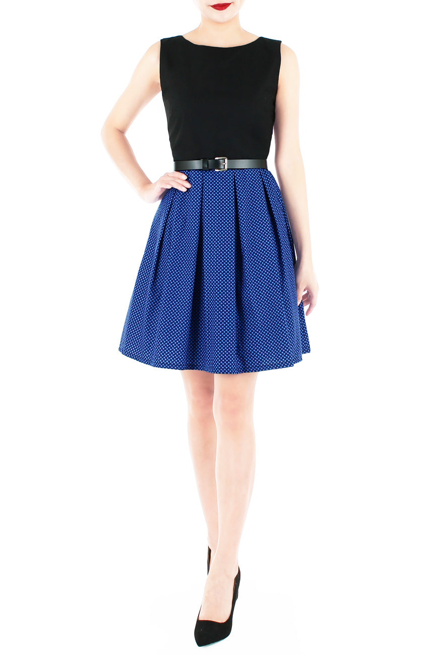 With your shoulders back and head held high in this black flare dress, there is no limit to what you can achieve! Flaunt the high neckline, sleeveless shoulders, nipped-in waist and a pleated flare skirt with an ultramarine blue-coloured lattice design to unlock your greatest accomplishments to come! Other details include: Double layered top, inner lining, side pockets and a concealed back zip. Made from cotton – breathable & machine washable (no colour bleed). Hand wash for initial wash.