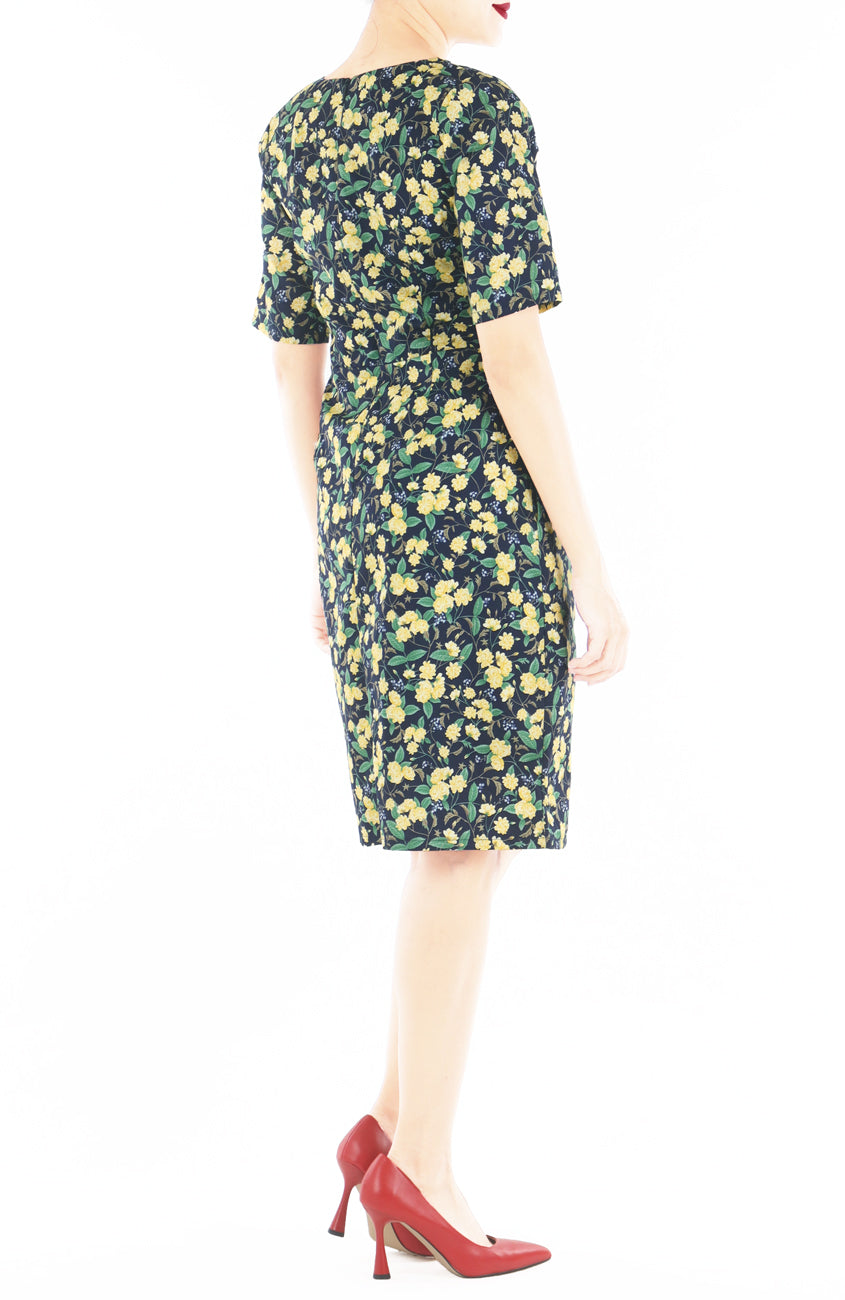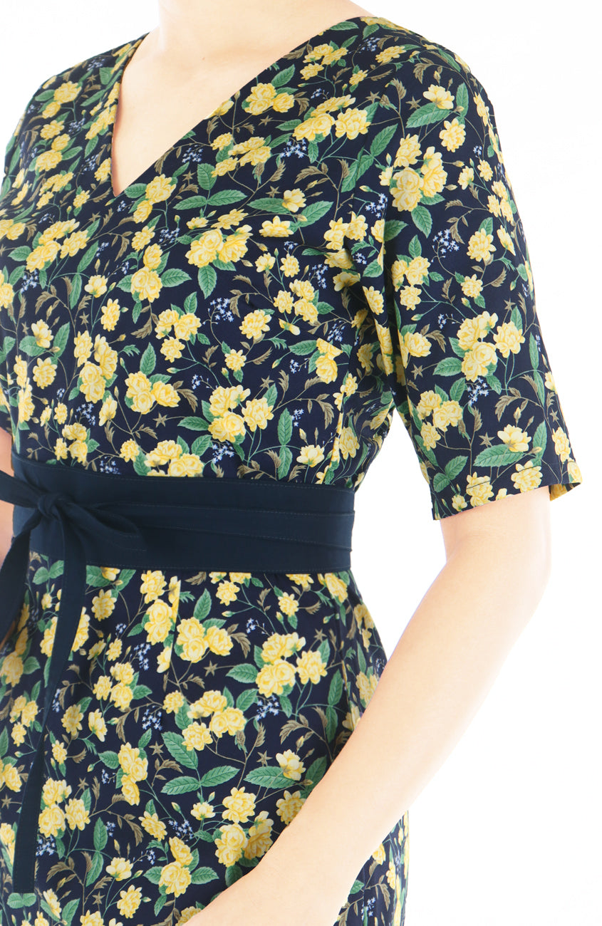 Step into the office with confidence and let the cheerful floral prints of this Diane dress bring a touch of sunshine to your day! An elegant navy dress adorned with vibrant yellow roses and delicate blue baby breaths, this number is perfect for brightening up your workday. Styled here with our Contemporary Obi Belt in Midnight Blue.
