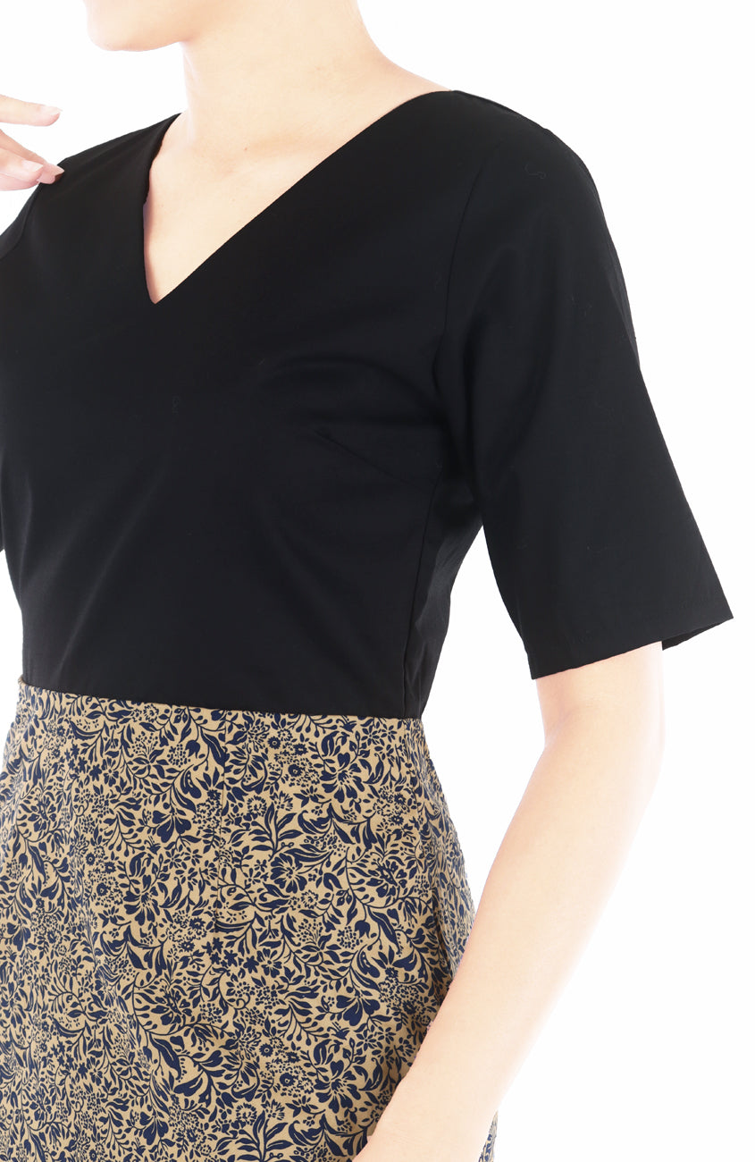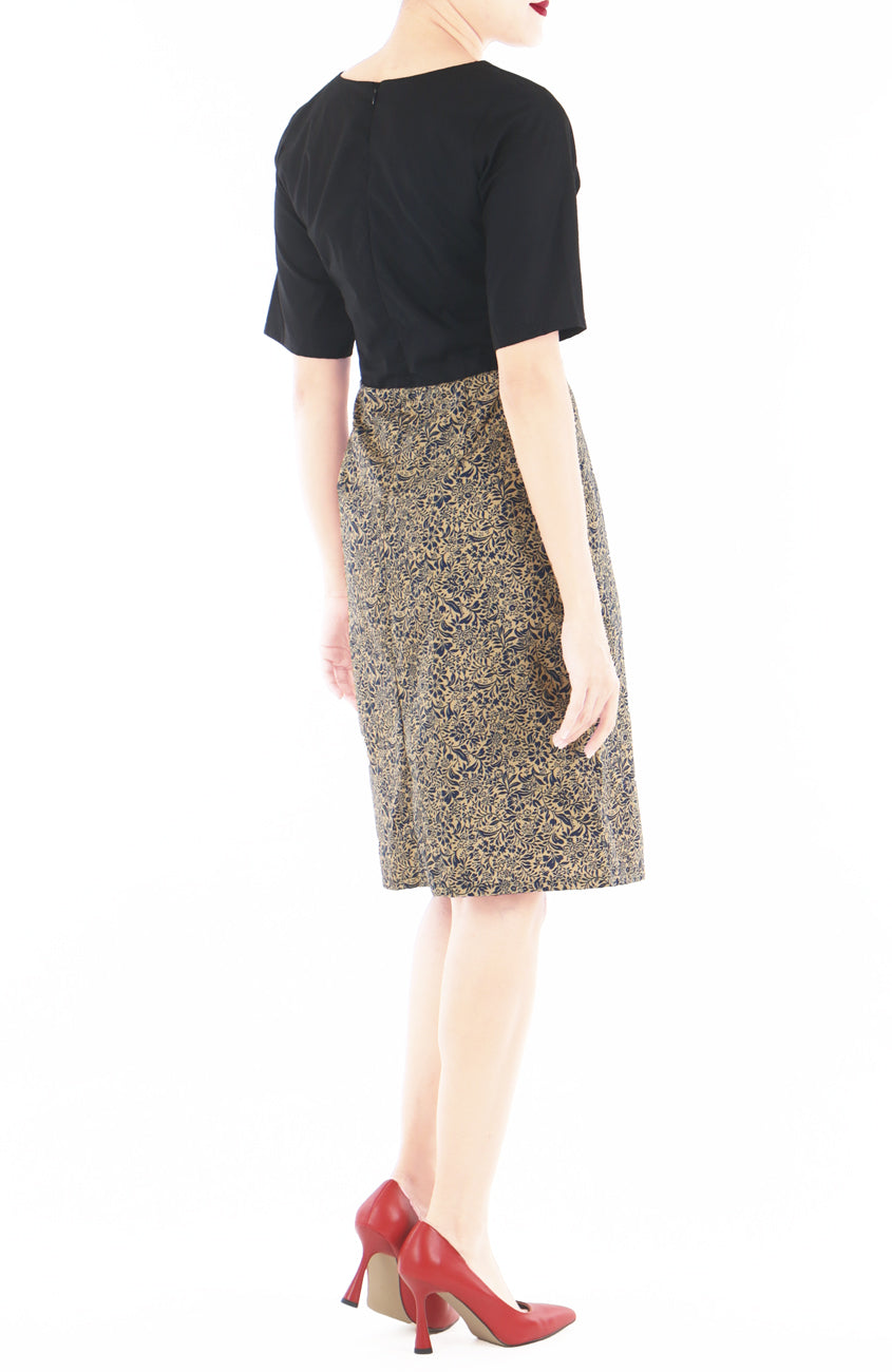 A chic addition to your workwear wardrobe, this classic dress showcases elegance with functionality! With its half-length sleeves and straight skirt featuring a lovely brown background with navy fern prints, this dress is both stylish and comfortable. The solid black top adds a touch of sophistication, making it versatile for any occasion. Pair it with your favourite belts for a fun and polished look! Styled here with our Contemporary Obi Belt in Noir Black (sold separately).