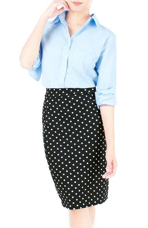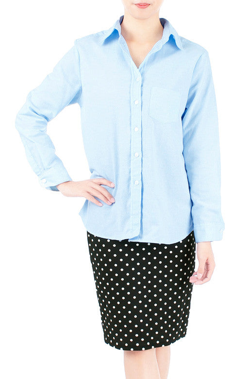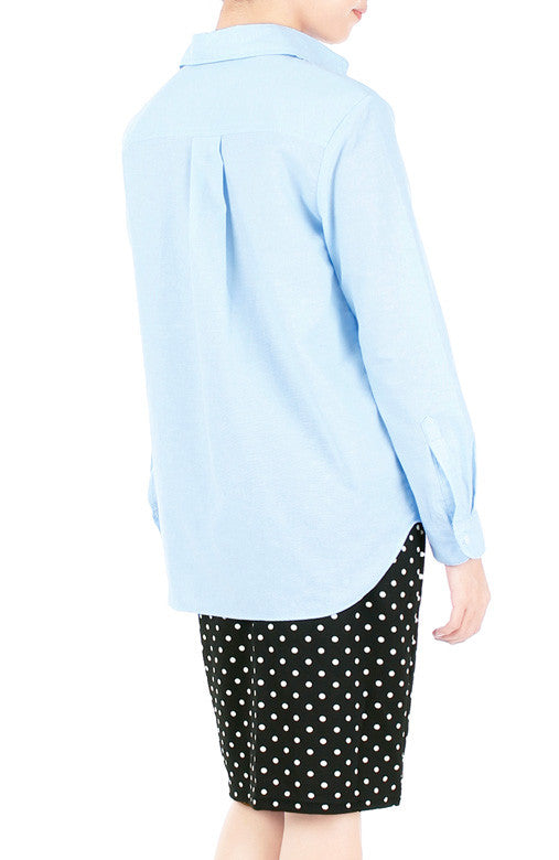 You couldn’t be more pleased with this ensemble that starts with this light- shade chambray, long-sleeved shirt! With a polka dot skirt, you exude confidence through your classic, casual style! The shirt features collars, button down detailing, one side pocket, long sleeves with cuffs, box pleat at the back and curved hem. Made from cotton.