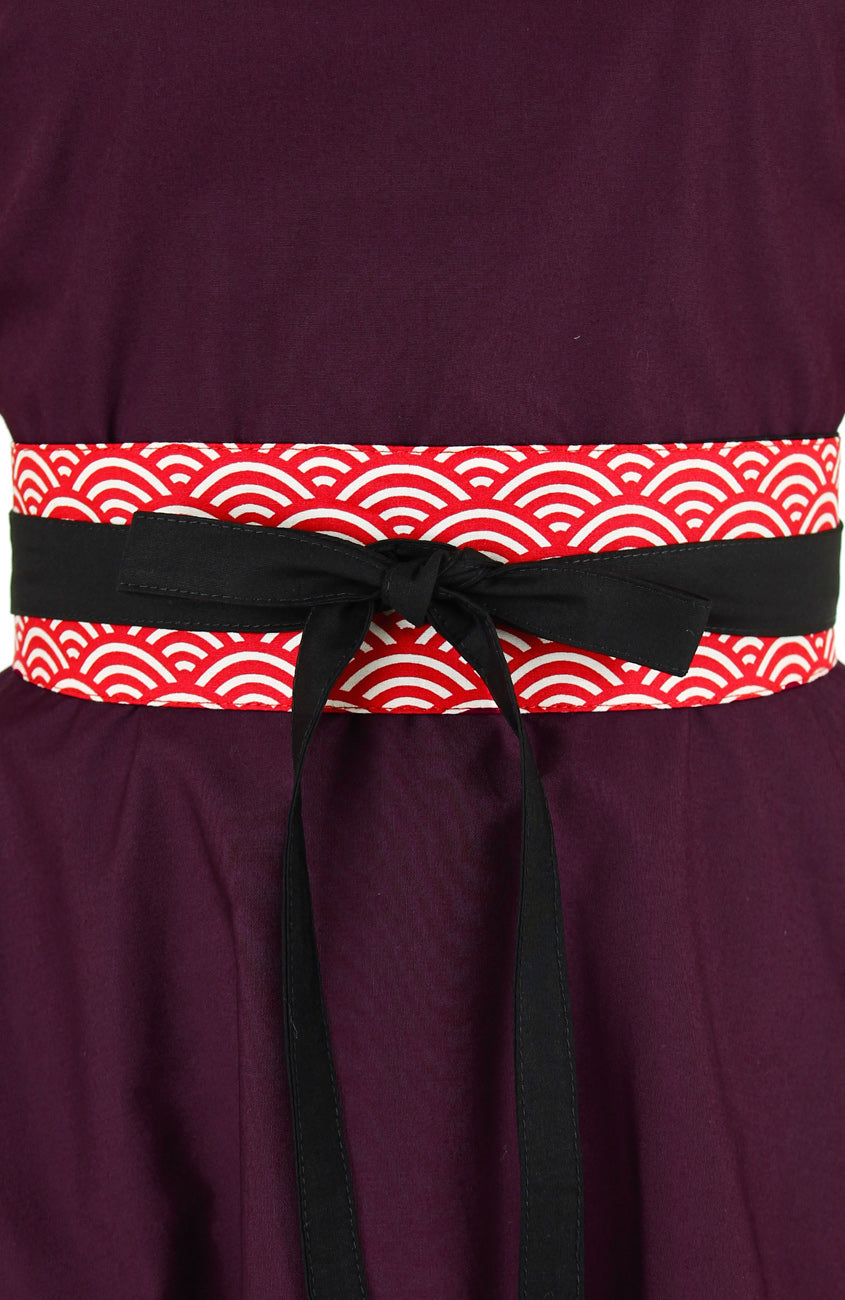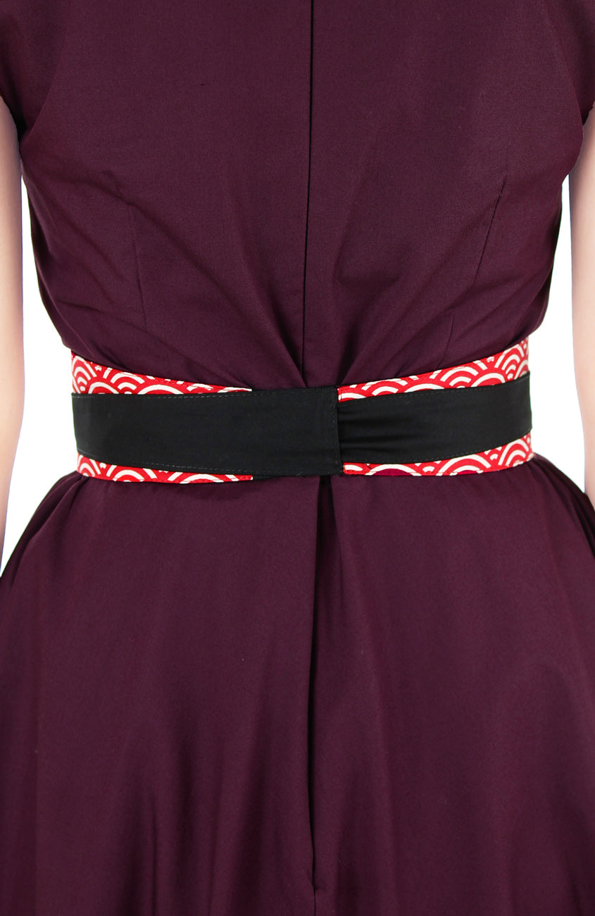 This contemporary obi belt in the classic seigaiha or wave pattern in red, white and black (representing surges of good luck), can be tied as loose or as tight as you’d like, for a perfectly snug, waist-cinching fit. It totally adds styling points to dresses or loose tops! Plus, it still fits you if your weight fluctuates. Featuring a slit on one side of the central panel, so it will sit neatly at the back. Styled here with our Classic Weekender Flare Tea Dress in Mulberry, and possibly, many others too!