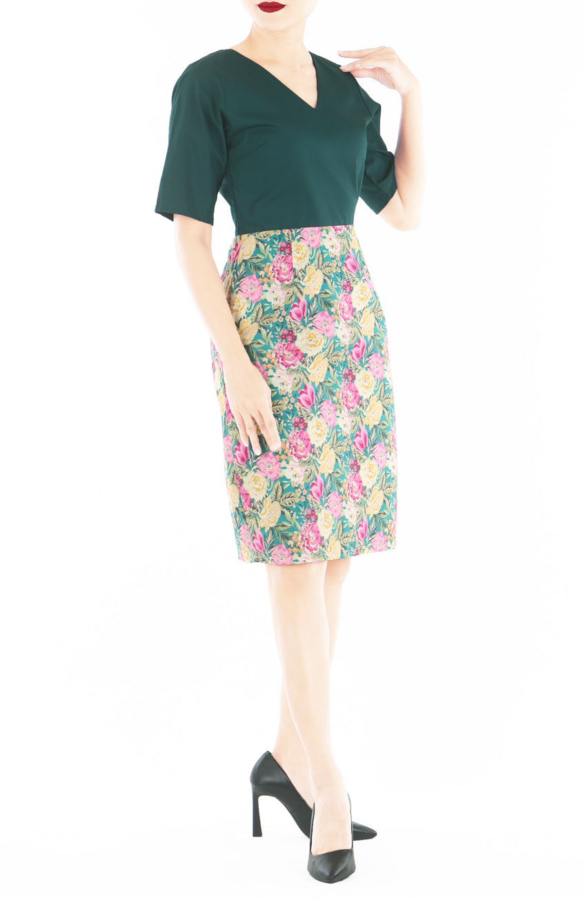 Make a statement at your next event with the Emerald Bosschaert Diane Dress – a piece that combines the elegance of an emerald top with the charm of a floral skirt, creating a stunning ensemble. Named after Ambrosius Bosschaert, one of the earliest Dutch painters known for his vivid floral masterpieces, this dress captures the beauty and artistry of a floral painting. Perfect for work or refined gatherings, this dress will lend you grace, embodying the elegant style you seek. Styled here with our Contemporary Obi Belt in Noir Black.