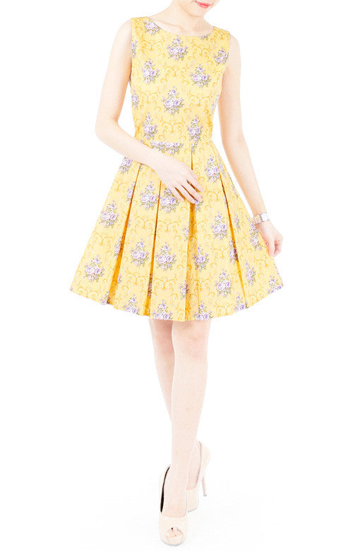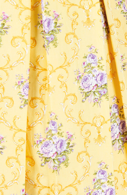 A romantic stroll in this yellow floral dress leads you to a moonlit arbor. As if magically, the roof’s starburst cutouts and ornate archways mimic your dress’s delicately printed flourish ornaments and violet roses bouquets. What a fortuitous outfit choice for such an enchanting evening! Other details include: double layered top, pleated flare skirt with inner lining and a hidden back zip. Made from cotton.
