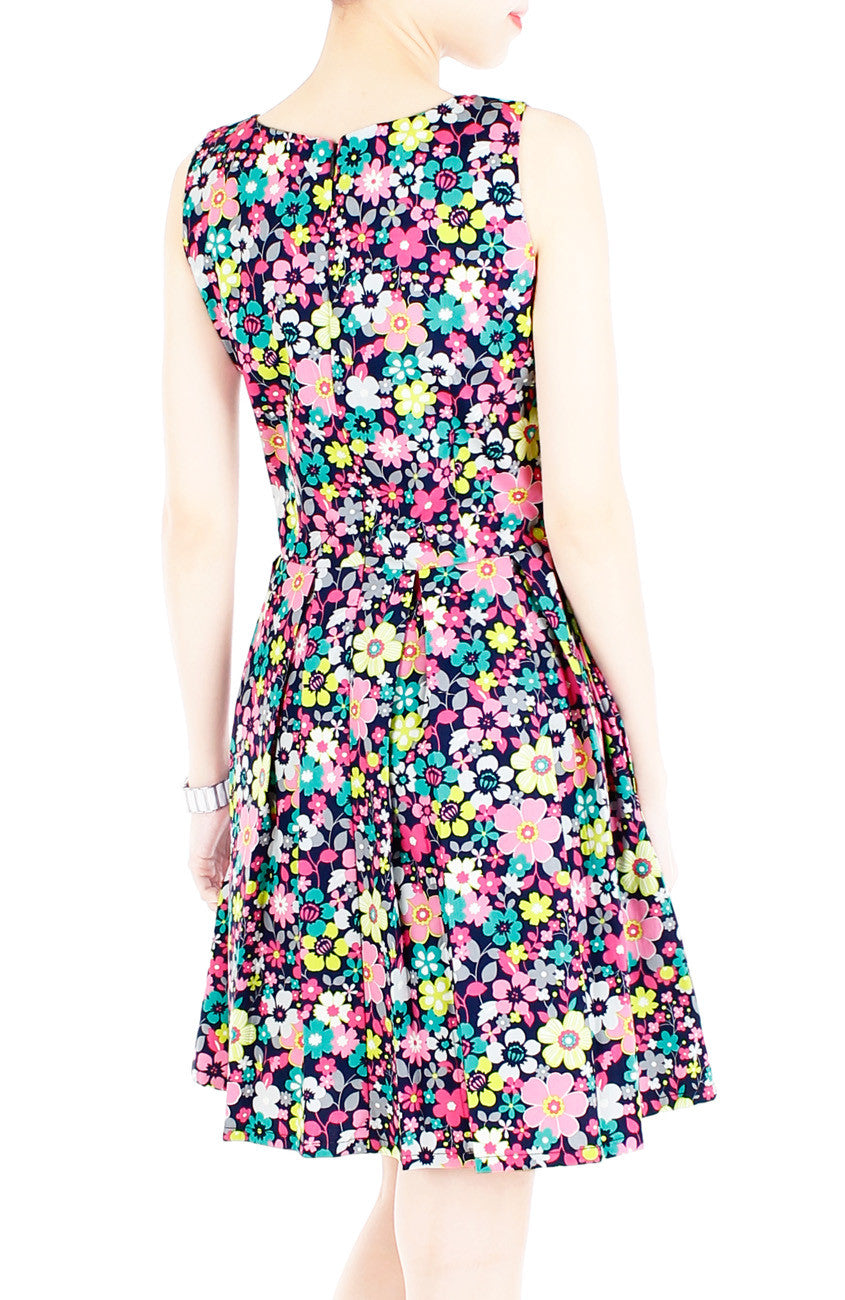Which is more luminous, the glamourous floral dress or the gorgeous budding home gardener who flaunts it? It’s an even tie between the pretty pink and green blooms printed on this navy blue dress and your sweet smile! Details include: Double layered top, flare skirt with inner lining, side pockets and a hidden back zip. Made from cotton.