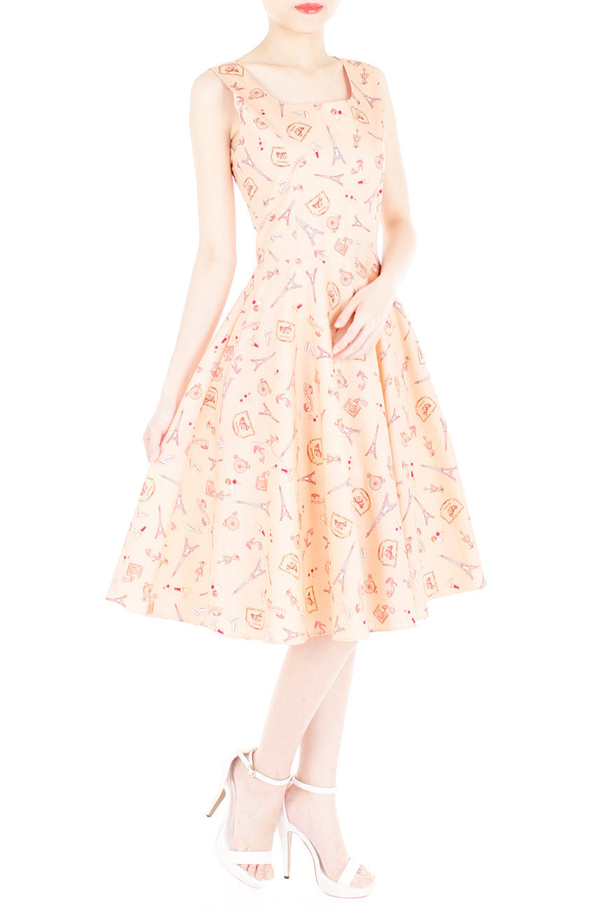 C’est magnifique pastel orange-coloured dress with delicate prints of the iconic Eiffel tower and all things French! It’s hard not to gush about this dress. Details include: Double layered front, inner skirt lining, hidden back zip and side pockets. Made from cotton.