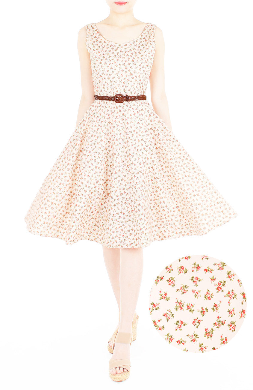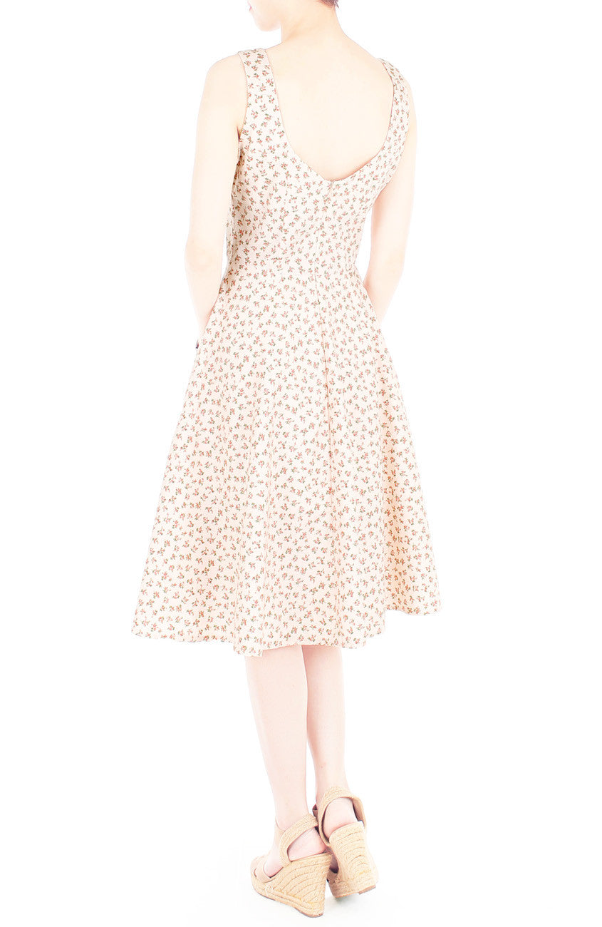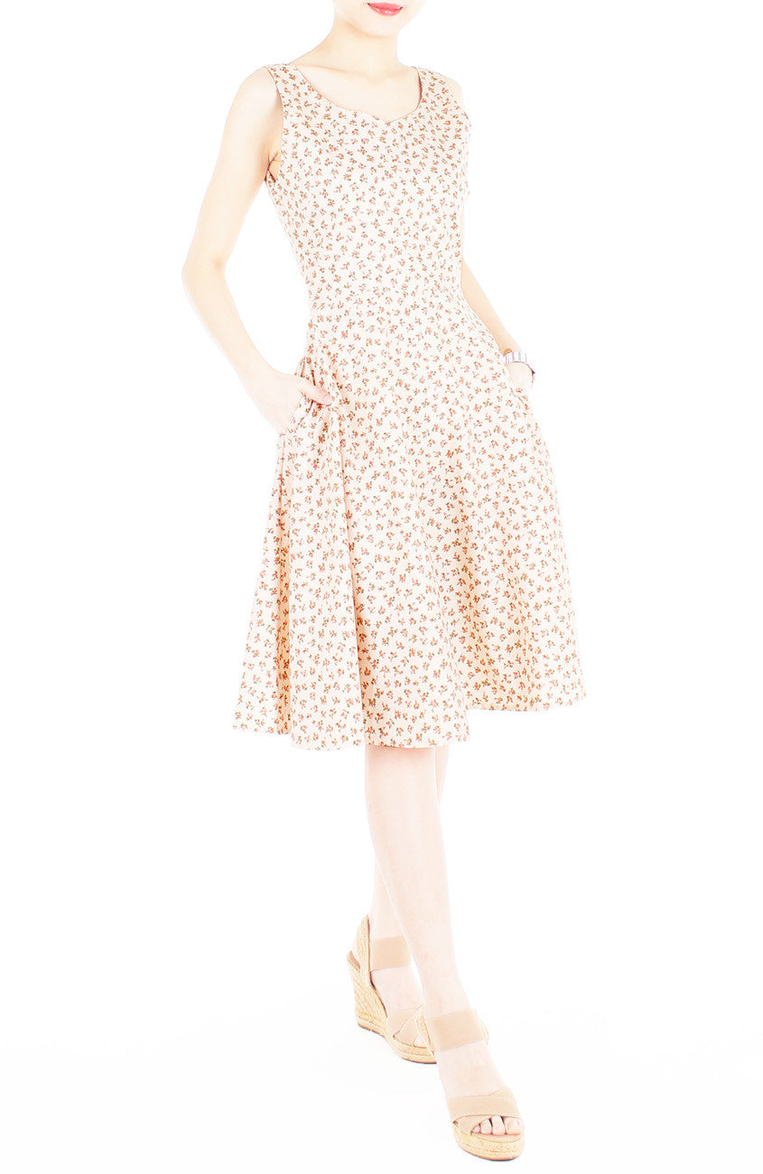 Make memories you’ll indulge later by appreciating the little maroon red florals on this light peach-coloured dress! A fresh pick from our label, this cotton darling ensures adoration in real time, thanks to its V-neckline and flare skirt with hidden side pockets! Brilliant! Details include: Double layered front, skirt lining and hidden back zip. Made from cotton.
