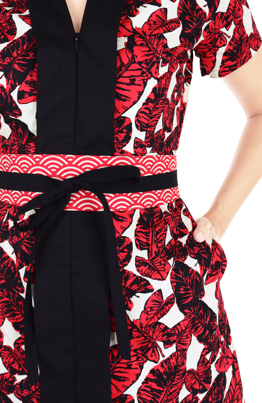 You’re bound to make heads turn with this modern Nyonya kebaya dress. From our Whitesoot label, this extraordinary piece takes inspiration from the traditional sireh (betel leaves) printed with red on an off-white background. Its’ black kebaya lapels create an outstanding accent to this contemporary kebaya.