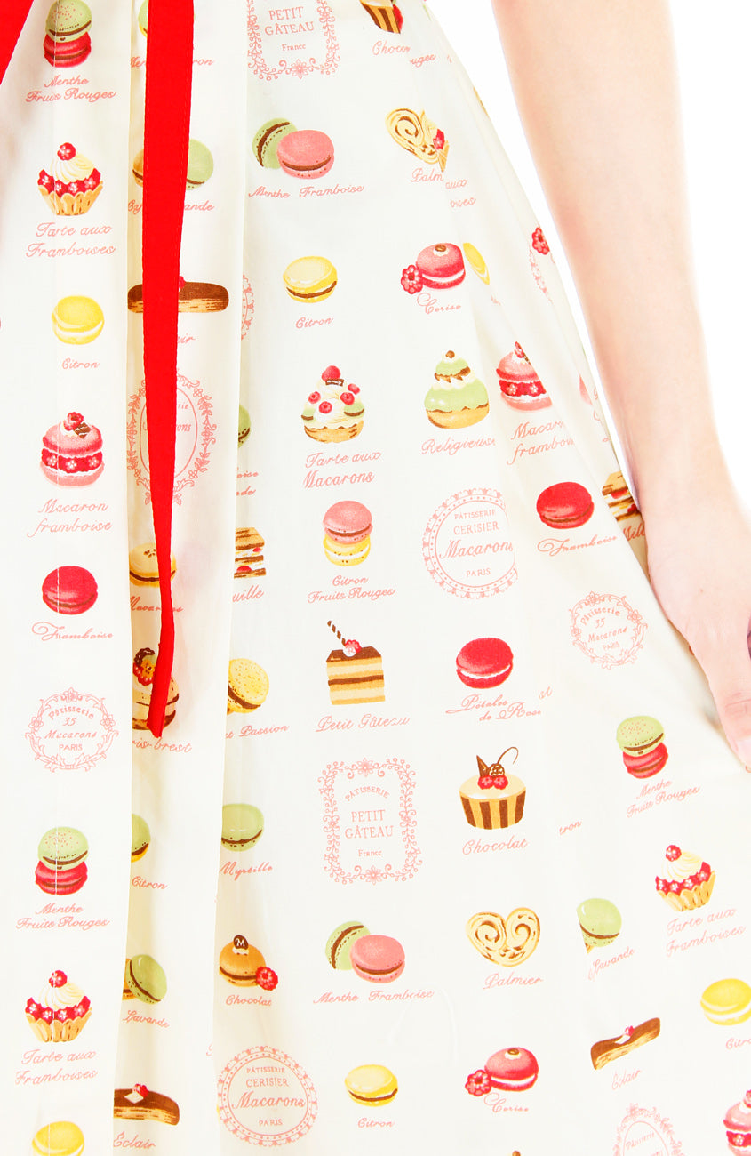 Charm everyone in your path by cheerfully going about in this adorable shirtdress! Covered with eclairs, macarons, mille-feuille, delectable petit gateau – and tailored with a crisp collars, side pockets, nipped-in waist, short sleeves and a pleated, flare skirt – this cream dress will enchant everyone you meet! Other details include: Double layered top, concealed placket with front button down fastening, inner lining for skirt and self-tied waist sash. Made from cotton – breathable & machine washable (no colour bleed). Hand wash for initial wash.