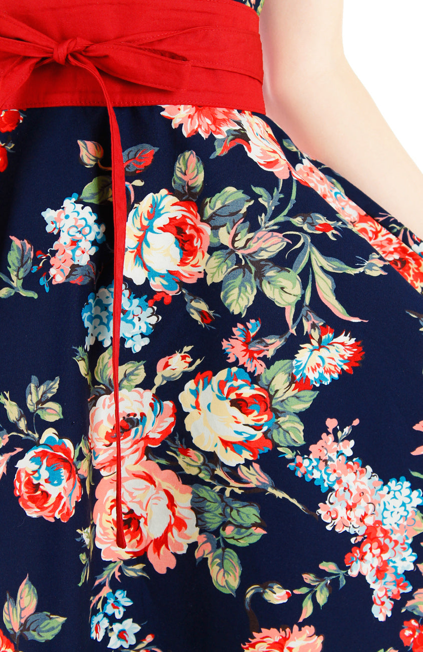 This fit and flare dress commences a lifetime of love with gorgeous peonies that blossoms with red, yellow and blue hues. An elegant boat neck, cap sleeves and a voluminous skirt further characterize this pink number, culminating in a celebration-ready look with plenty of romantic whimsy. Styled here with our Contemporary Obi Belt in Scarlet Red. Details include: Double layered top, side pockets, inner skirt lining and concealed back zip. Made from cotton – breathable & machine washable (no colour bleed). Hand wash for initial wash.