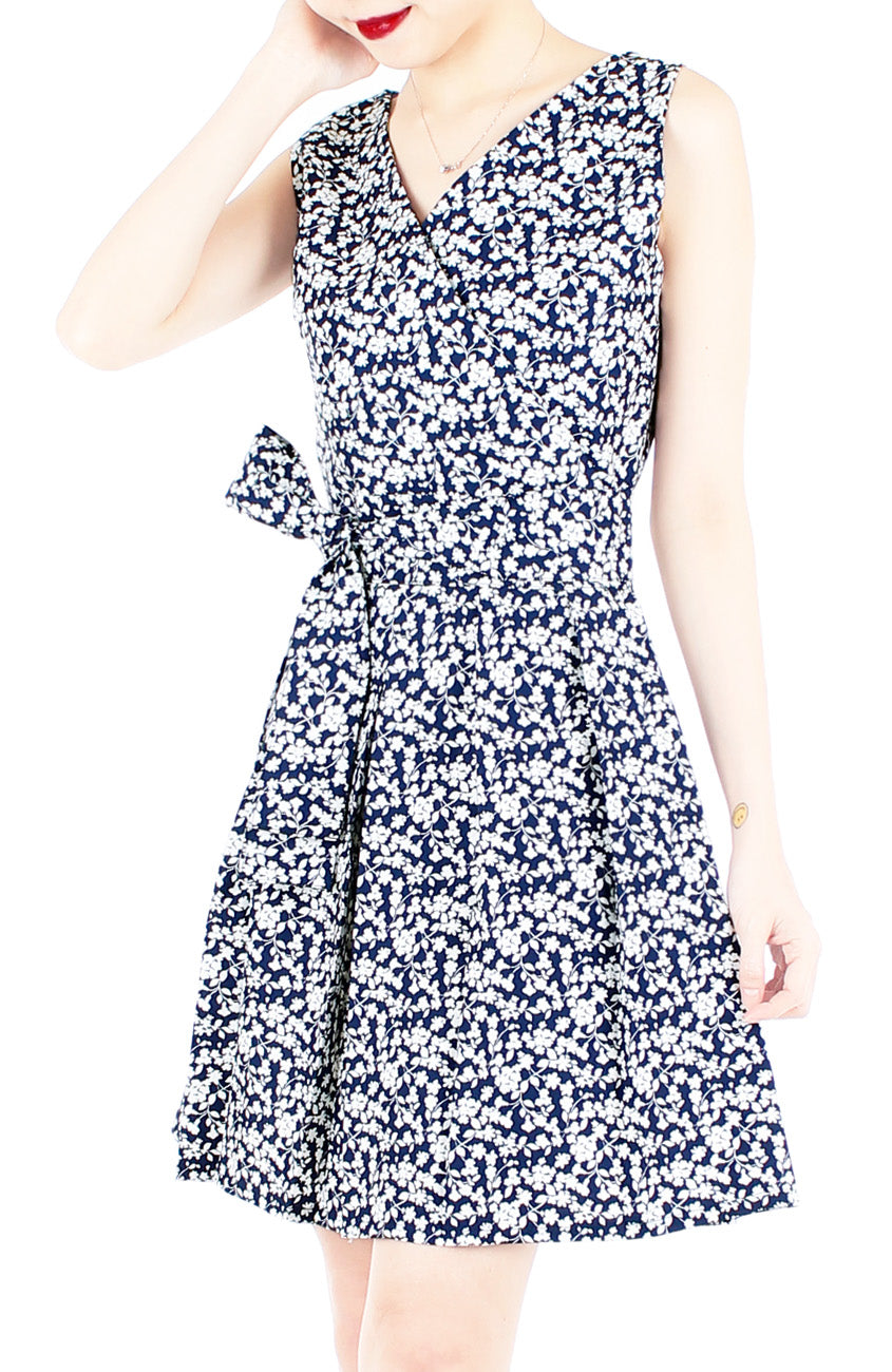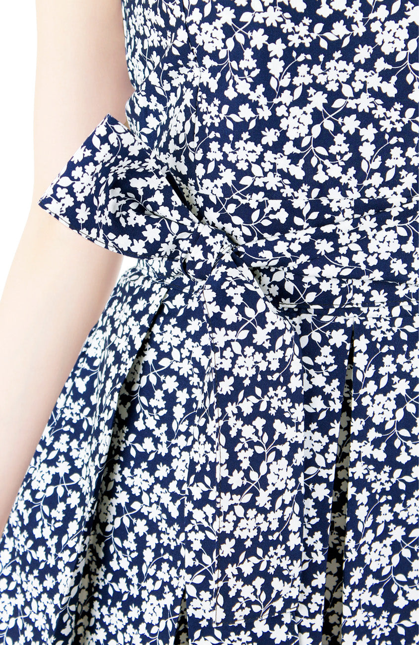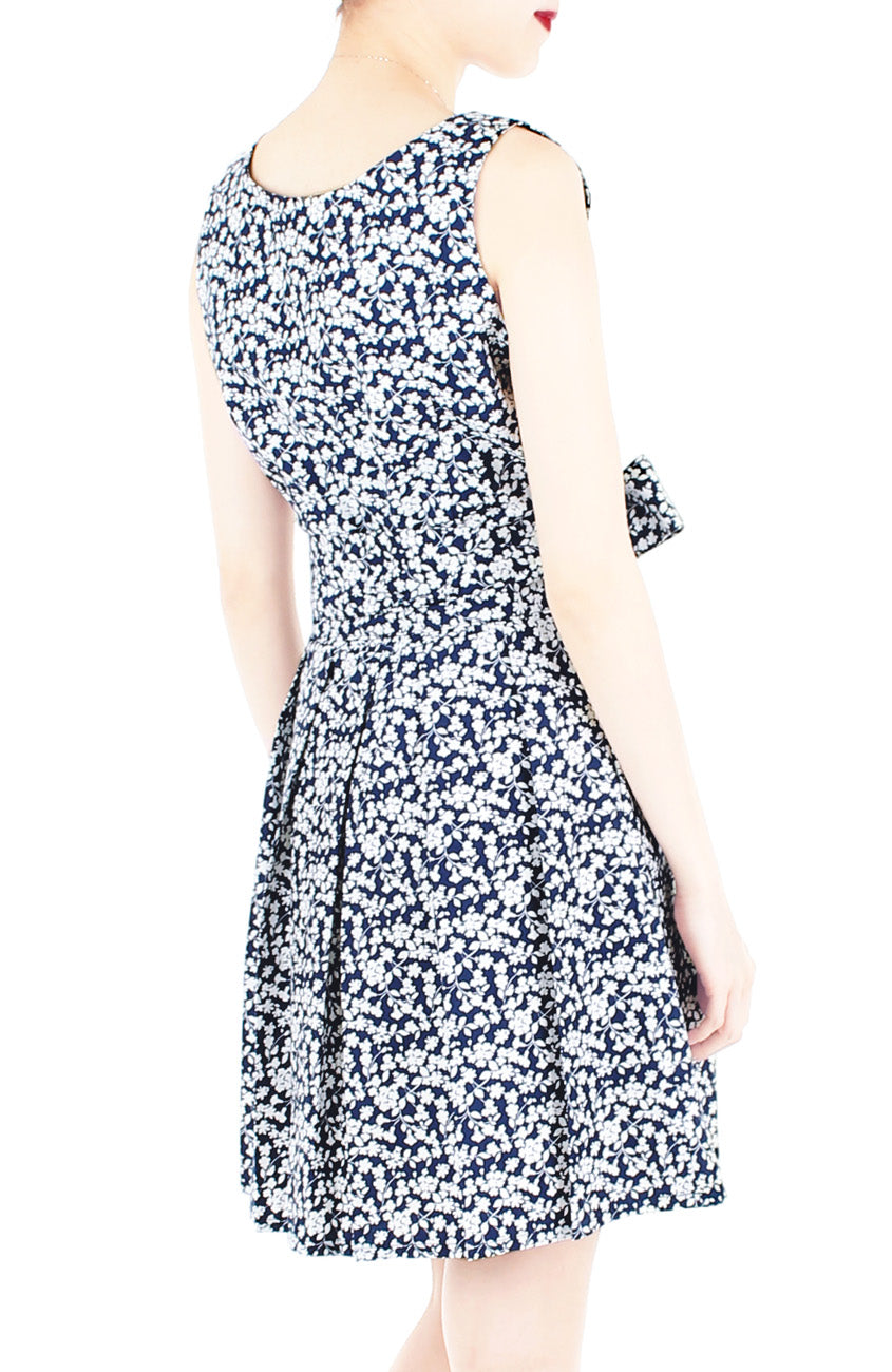 Any occasion could stand to have a little extra romance, and this flare dress is always up to be the bearer of ladylike loveliness! Featuring white florals and vines atop a midnight blue shade, this dress exudes utter sweetness. Details include: Double layered top, pleated skirt with inner lining, side pockets and a concealed side zip. This dress gives you two different styling options as it features two different necklines, V-neck or boat neck. It comes with a matching, detachable belt too. Made from cotton.