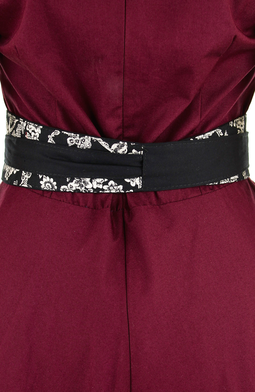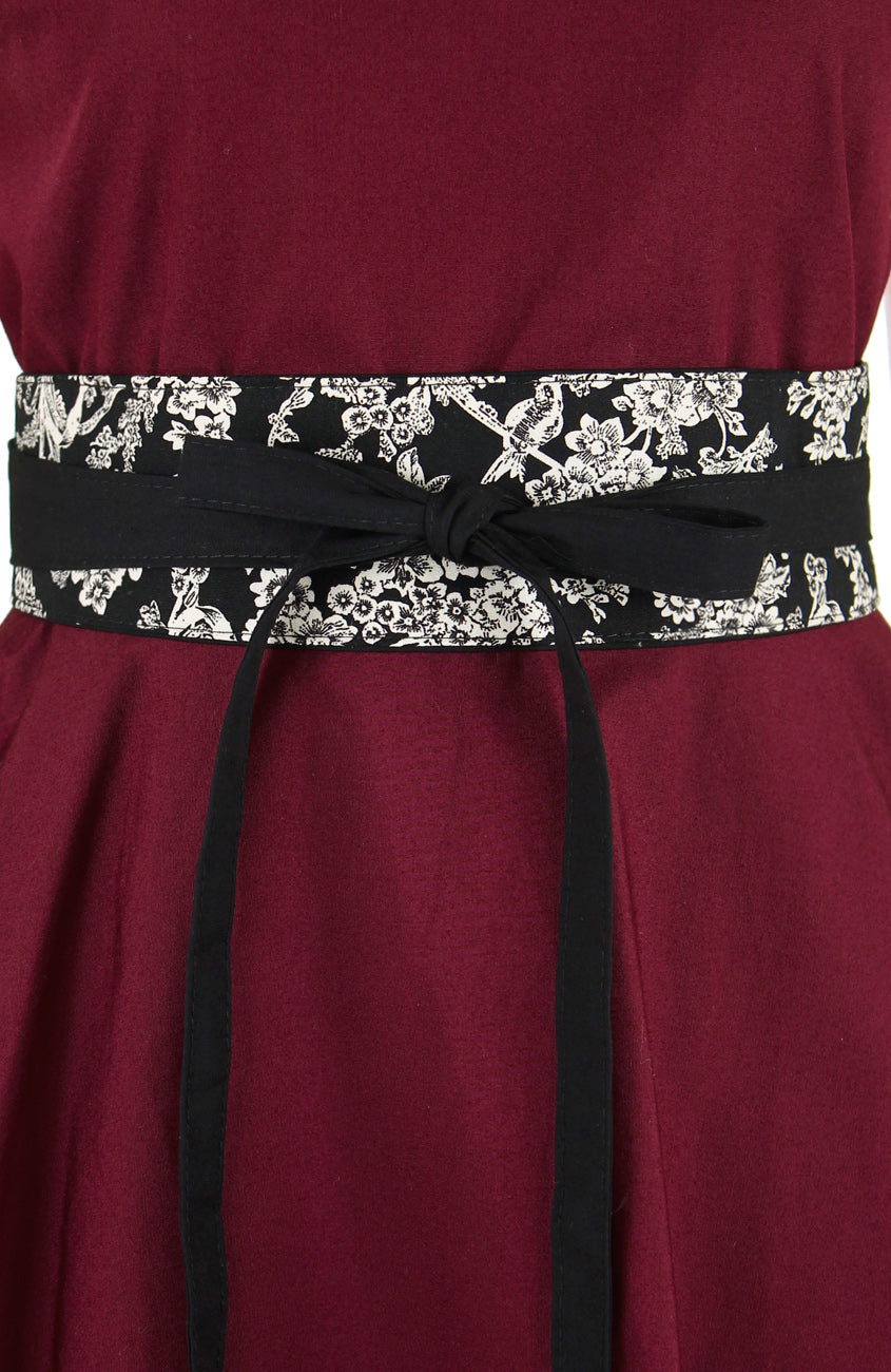 This contemporary obi belt in a beautiful black and off-white toile print, can be tied as loose or as tight as you’d like, for a perfectly snug, waist-cinching fit. It totally adds styling points to dresses or loose tops! Plus, it still fits you if your weight fluctuates. This obi belt is reversible and can be worn two ways - with toile print front, or solid black. Featuring a slit on one side of the central panel, so it will sit neatly at the back. Styled here with our Classic Weekender Flare Tea Dress, and possibly, many others too!