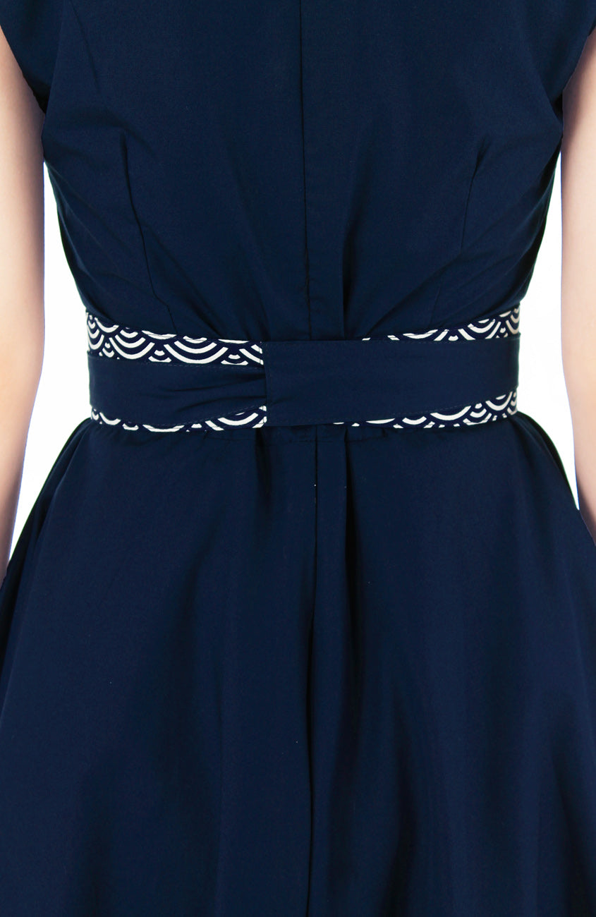 This contemporary obi belt in the classic seigaiha or wave pattern in midnight blue and white (representing surges of good luck), can be tied as loose or as tight as you’d like, for a perfectly snug, waist-cinching fit. It totally adds styling points to dresses or loose tops! Plus, it still fits you if your weight fluctuates. Featuring a slit on one side of the central panel, so it will sit neatly at the back. Styled here with our Classic Weekender Flare Tea Dress in Riviera Blue, and possibly, many others too!