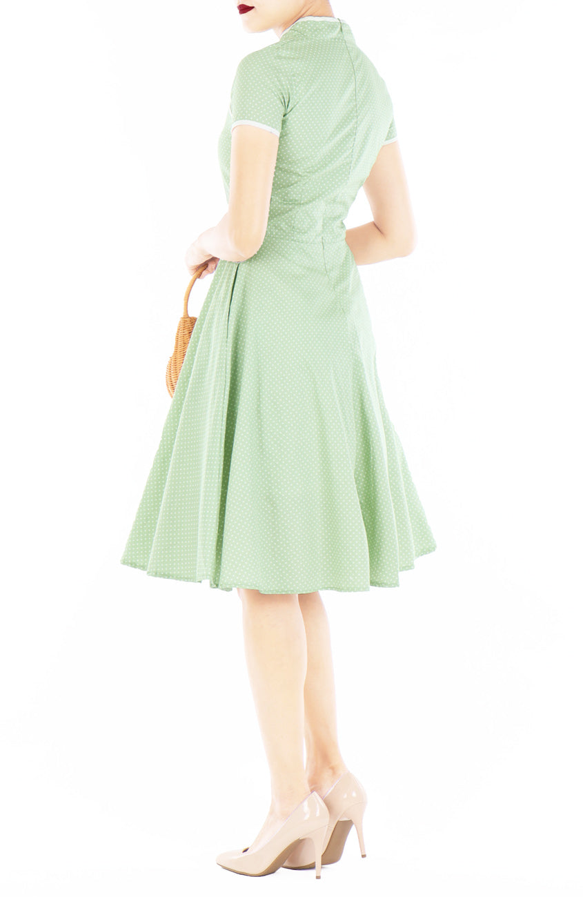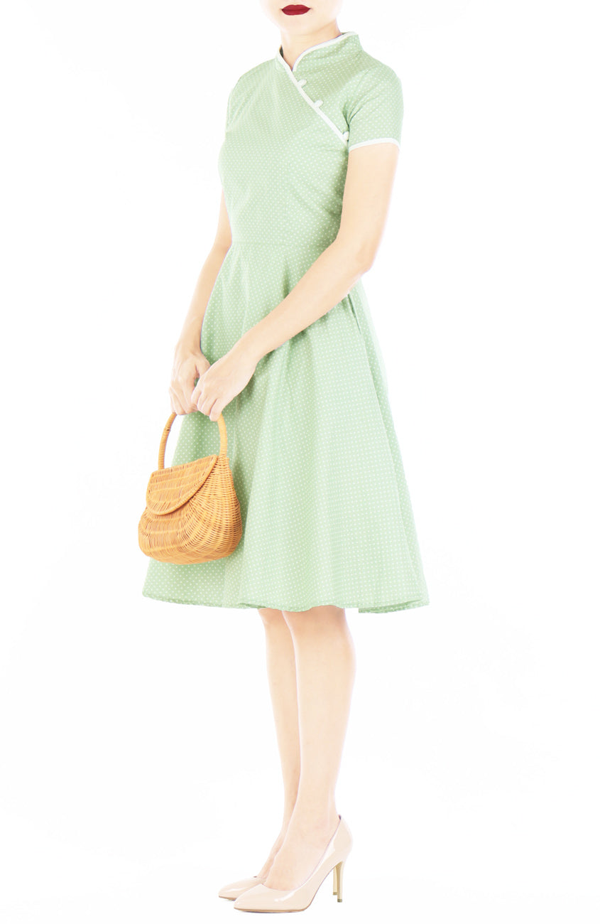 You’re at the height of vintage-inspired fashion in this antique green cheongsam with polka dots, exclusively designed by Whitesoot! Featuring off-white piping and Chinese buttons, this tea length beauty is perfect for special occasions and weddings.