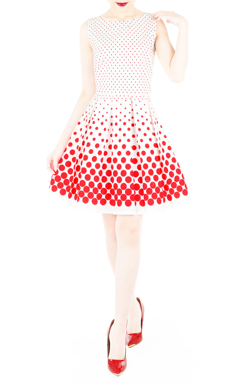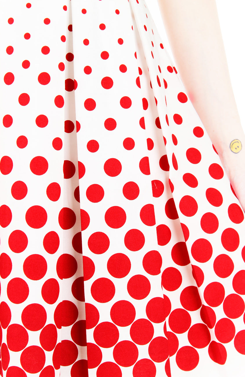 Secure a window seat at your favourite café in this gorgeous dress! Featuring red polka dots and a fit-and-flare silhouette, this white dress is a sweetly stylish treat. Details include: Double layered top, flare skirt with inner lining, side pockets and a concealed back zip. Made from cotton.