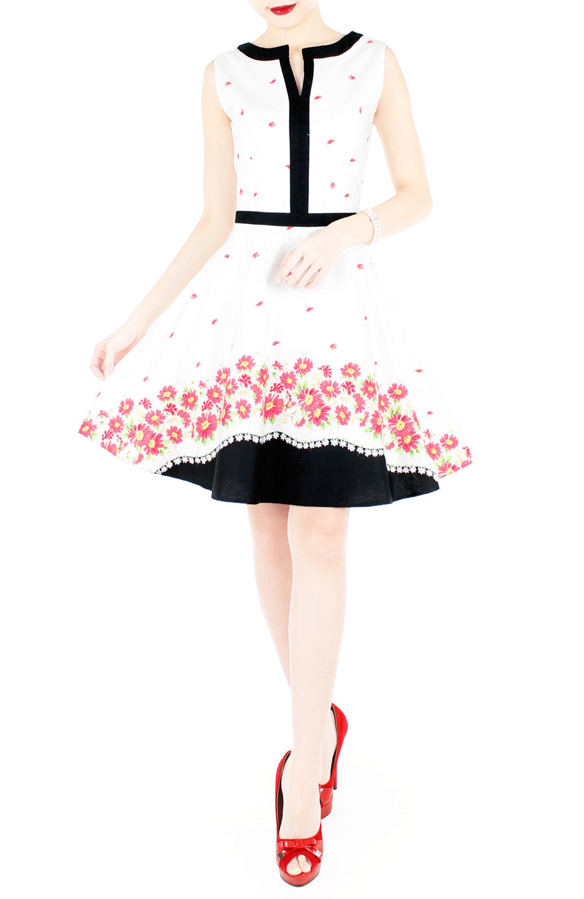 Carmine Daisies Flare Dress with Black Trims - White