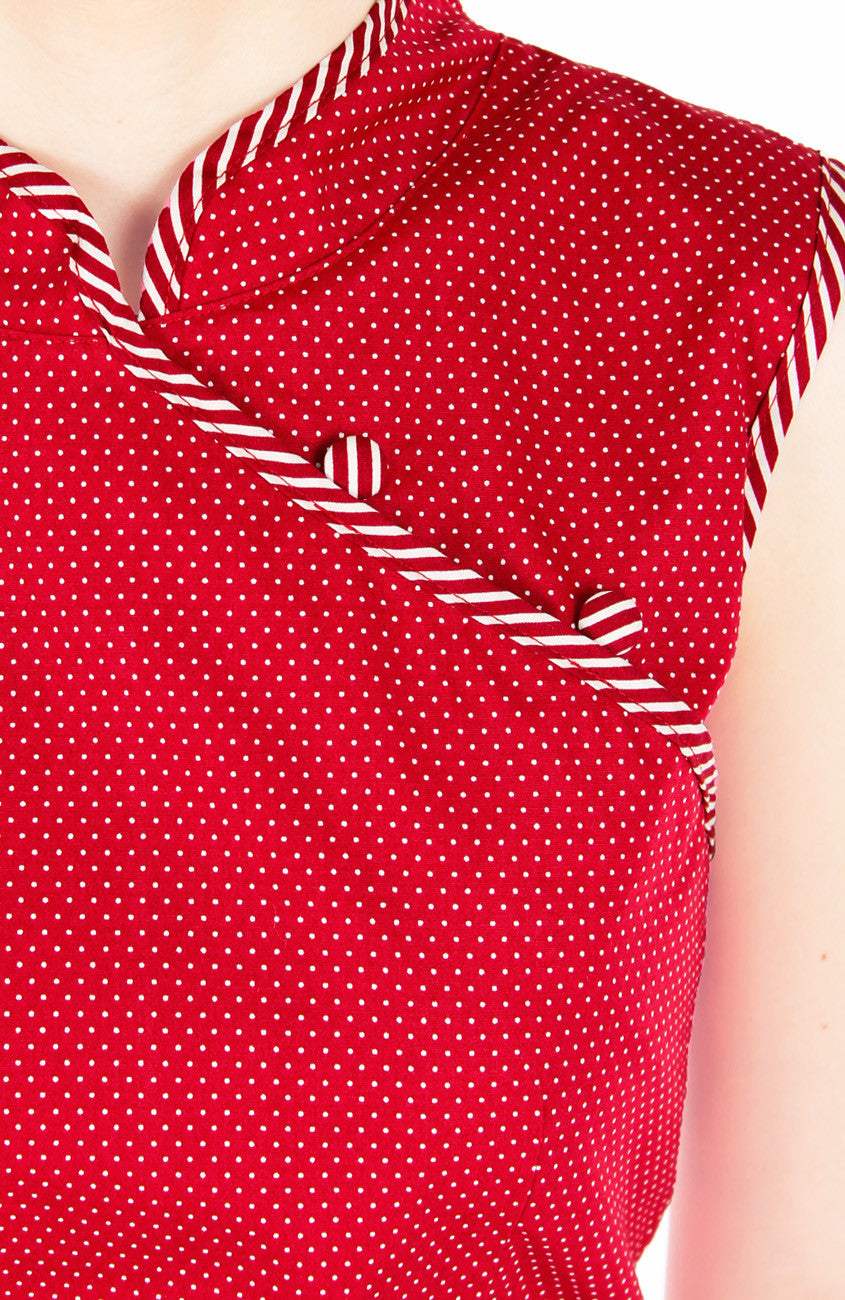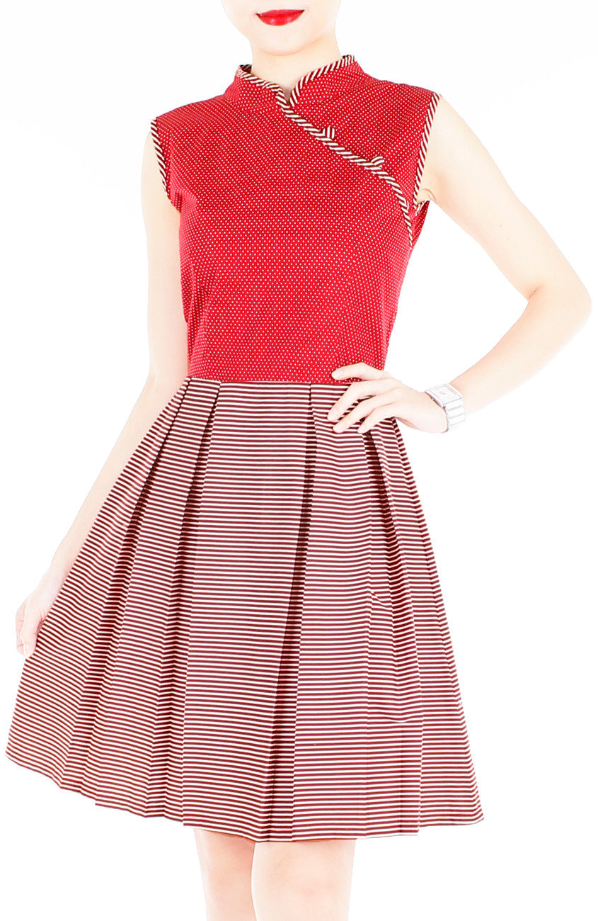 Your taste is well-cultivated, meaning you’re a gal that knows what she wants in a fancy dress! Enter this perfectly combination of polka dots and stripes in a traditional cheongsam dress, and this speaks to every part of your sophisticated style criteria! Details include: High neck Mandarin collars, buttons (non-functioning), double layered top, flare skirt with inner polyester lining and a hidden back zip. Made from 100% cotton, breathable & perfect for the hot & humid New Year weather. Machine-washable (colour does not bleed). Matching kids dress is available.