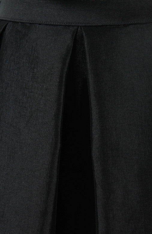 Living the good life looks even greater when you twirl into this fabulous black-coloured satin midi skirt! With lovely pleats, a thick waistband, hidden side zip, inner lining and elastic back, this skirt welcomes lovely evenings spent wining and dining. Made from satin polyester. Slightly stretchable.