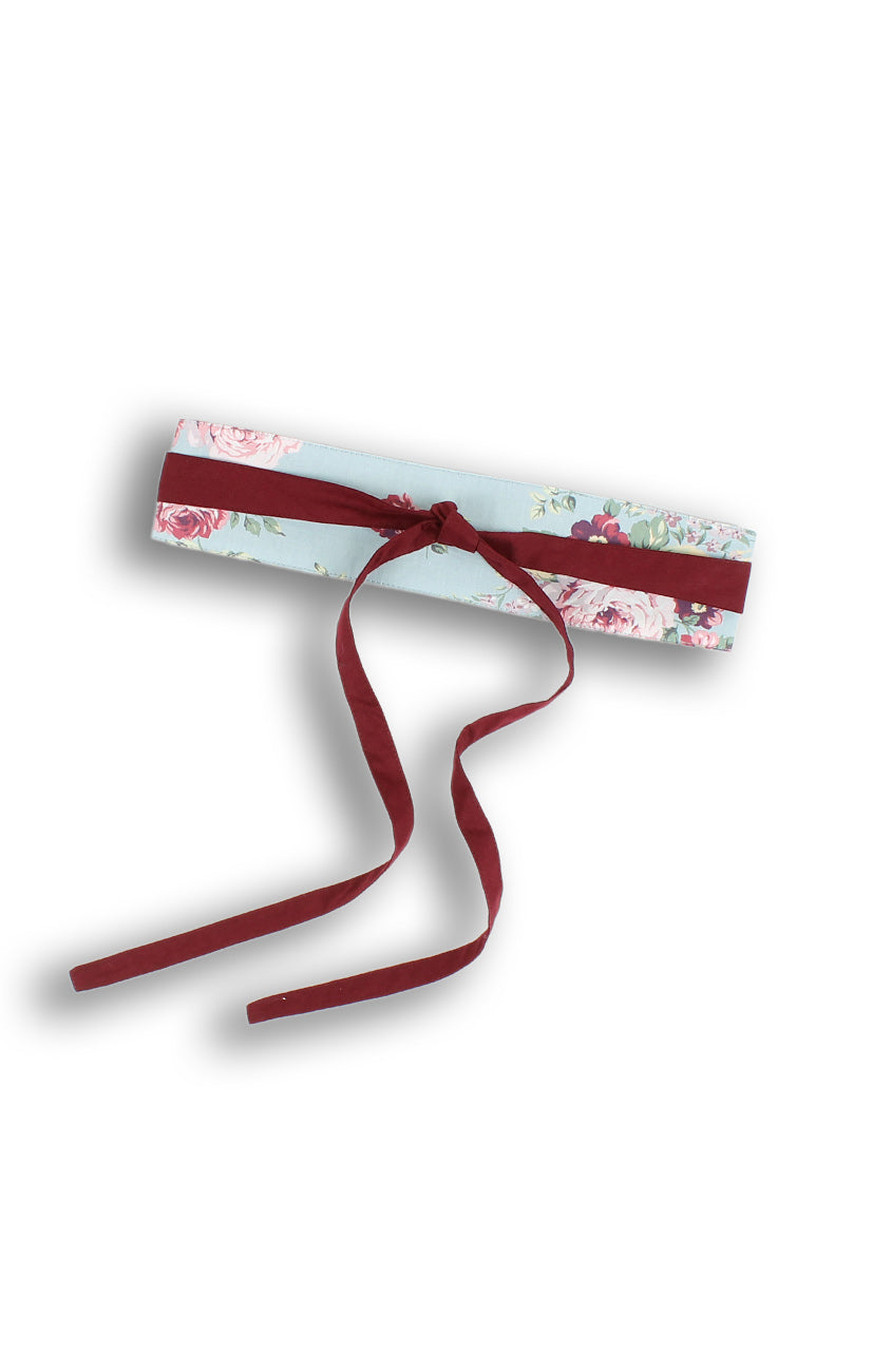 This contemporary obi belt in a powder blue vintage rose print, can be tied as loose or as tight as you’d like, for a perfectly snug, waist-cinching fit. It totally adds styling points to dresses or loose tops! Plus, it still fits you if your weight fluctuates. This obi belt is reversible and can be worn two ways - with floral front, or solid burgundy. Featuring a slit on one side of the central panel, so it will sit neatly at the back.