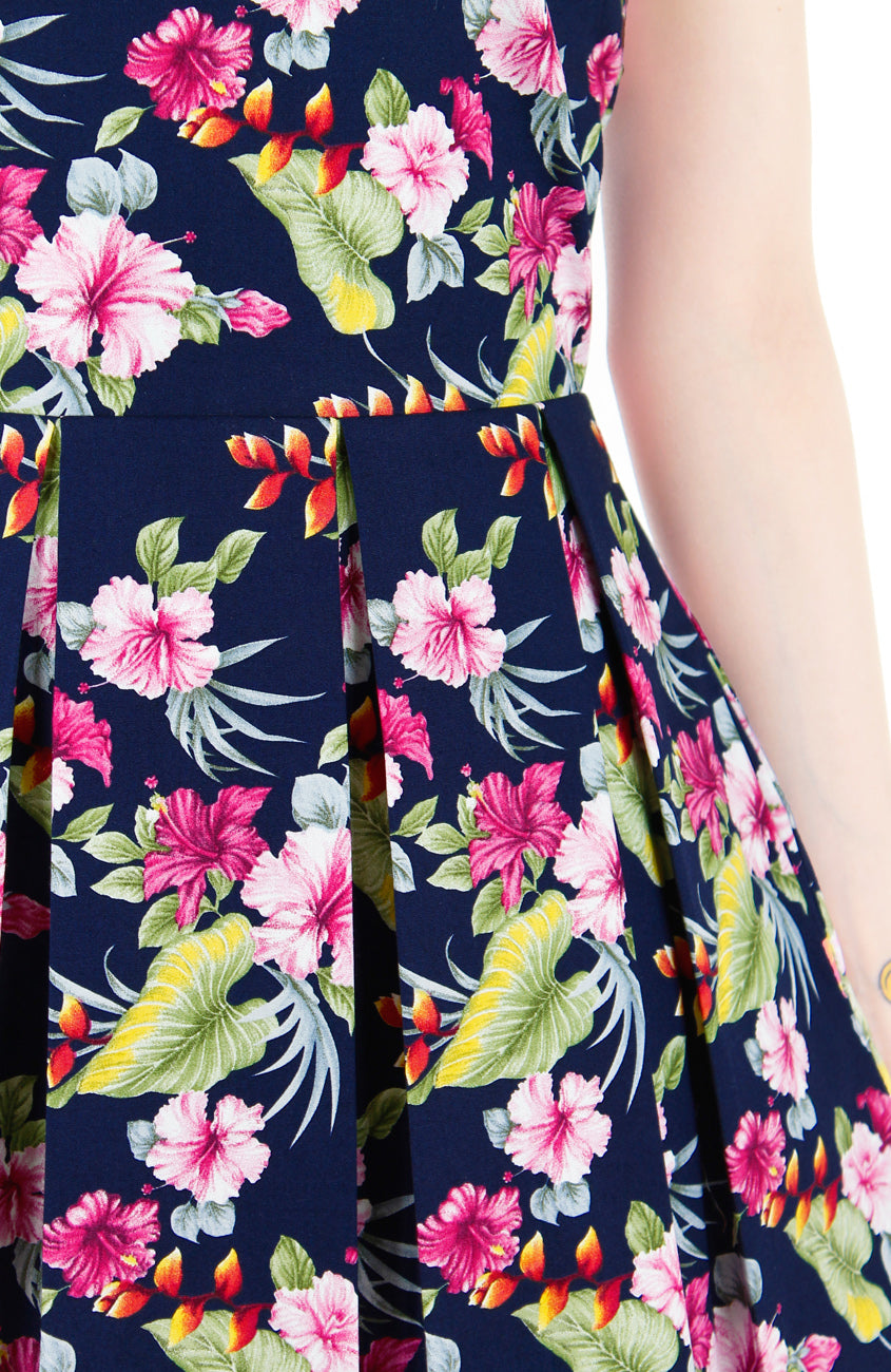 Rocking this blue dress is always a classy yet fun decision – no party plans necessary! But, if friends care to stop by while you’re styled in this pretty hibiscus and palm printed dress, you won’t say no! This pocketed dress is a real delight! Details include: Double layered top, short sleeves, pleated flare skirt with inner lining, side pockets and a concealed back zip. Made from cotton.