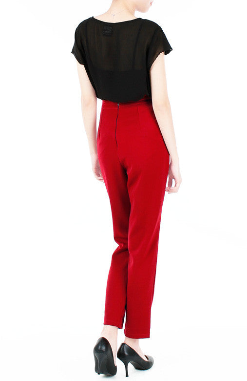 These gorgeous pair of red pants provide a go-to foundation for most of your office or work looks! They feature a high-waist silhouette, tapered cut, two side pockets and a hidden back zip. Made from polyester. Slightly stretchable.