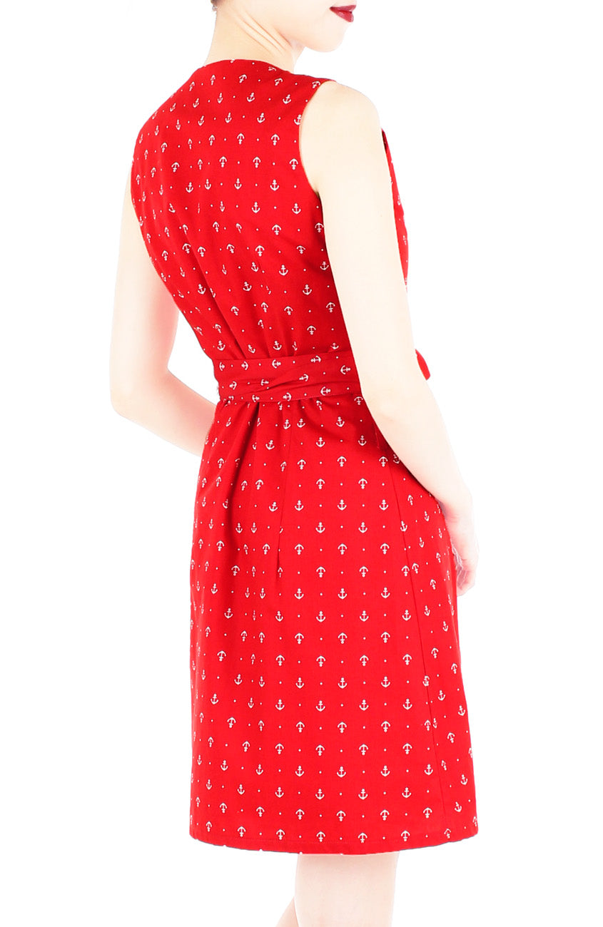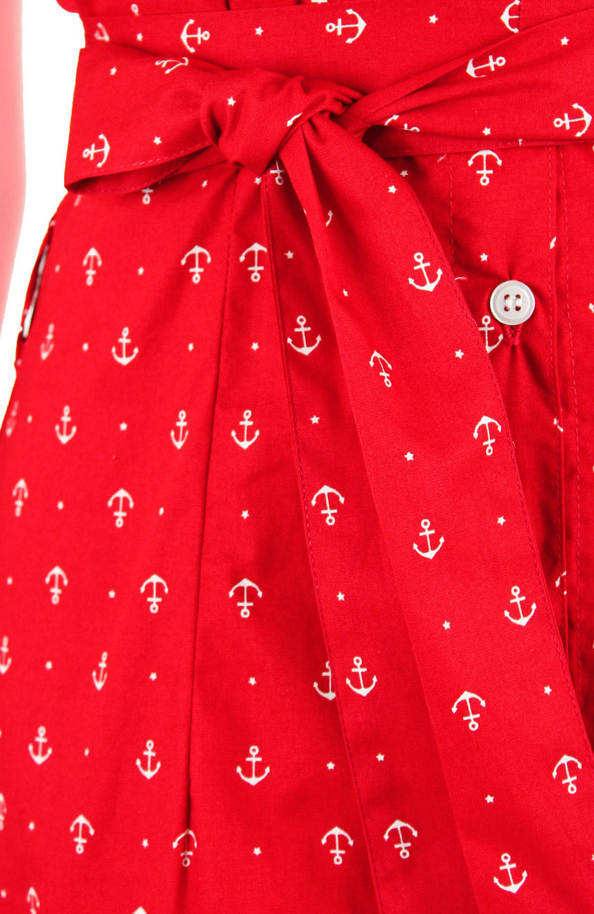 Greet your friends this weekend with excitement and energy that this printed cherry red dress brings to the meet up! A nautical vibe emanates from the anchor prints of this feminine button down dress. Other details include: Belt loops and dress is entirely lined. Also comes with a matching self-tie, detachable waist sash. Made from cotton.