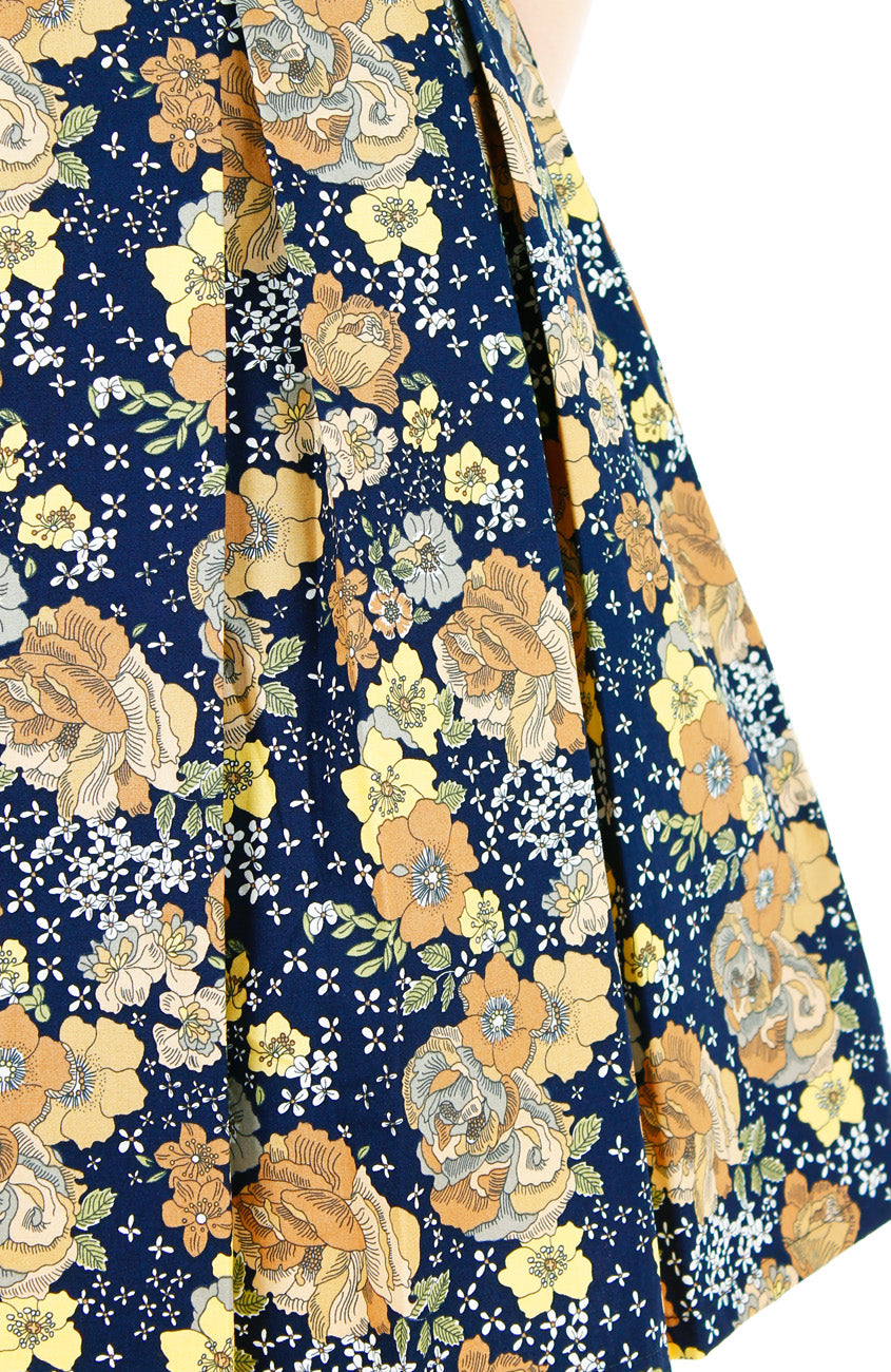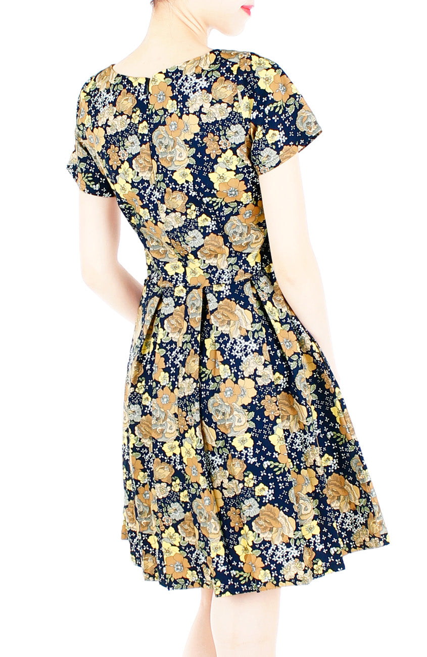 Start your autumn getaway with a morning stroll wherein the sun shines down on this navy blue dress. The delicate brown florals gracing the dress is a chic touch that’ll style your afternoon al-fresco coffee date. Details include: Double layered top, short sleeves, pleated flare skirt with inner lining, side pockets and hidden back zip. Made from cotton.