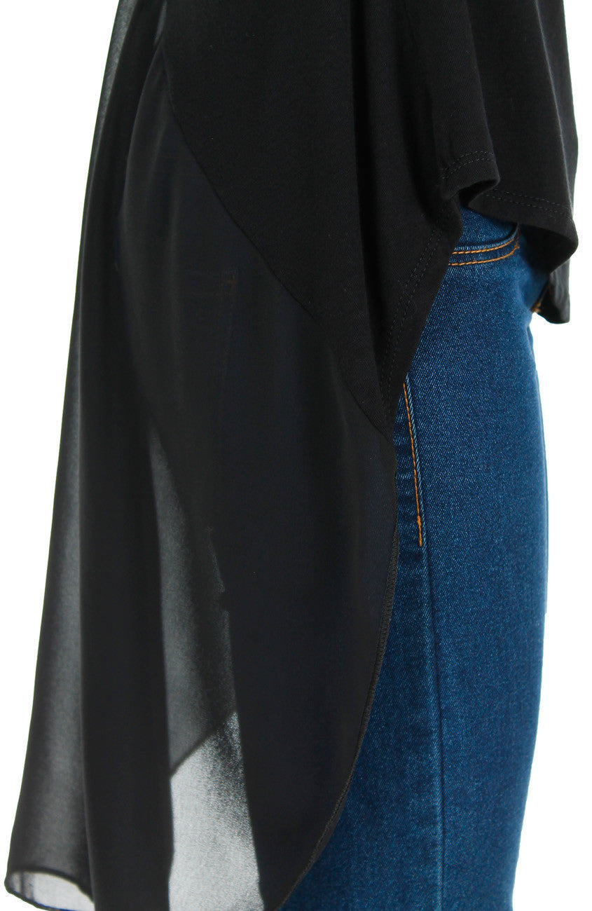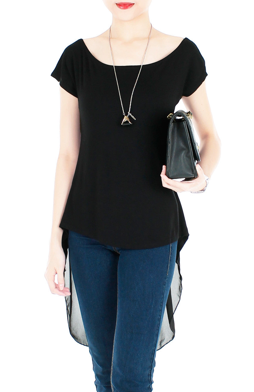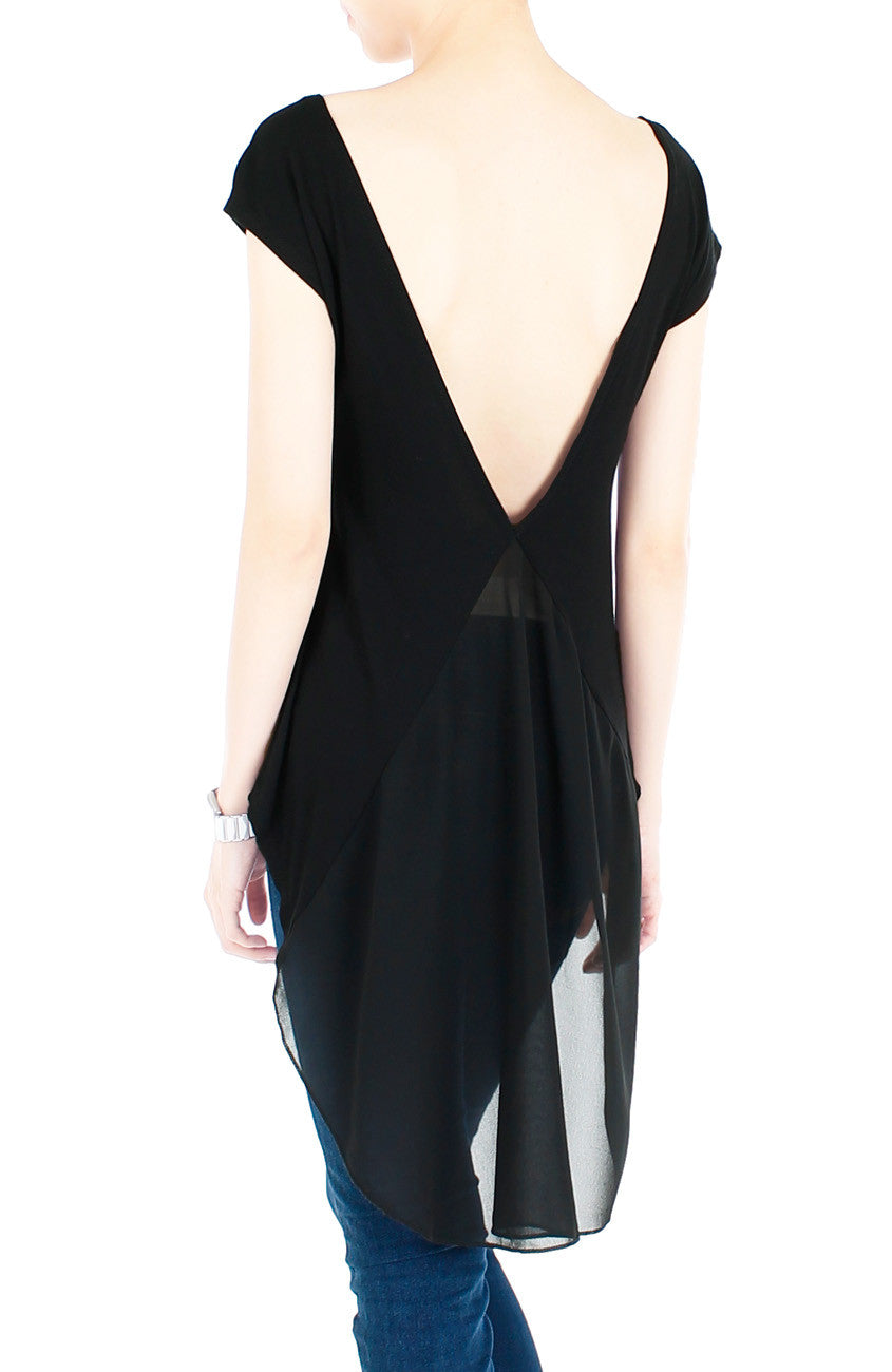 You look forward to spending free time in the next city escape, and when you spy this top, you know it’s the perfect float-y black tee for an afternoon adventure! This tee is made from cotton polyester blend with a deep V-back and a semi-sheer tail. Made from cotton and polyester.