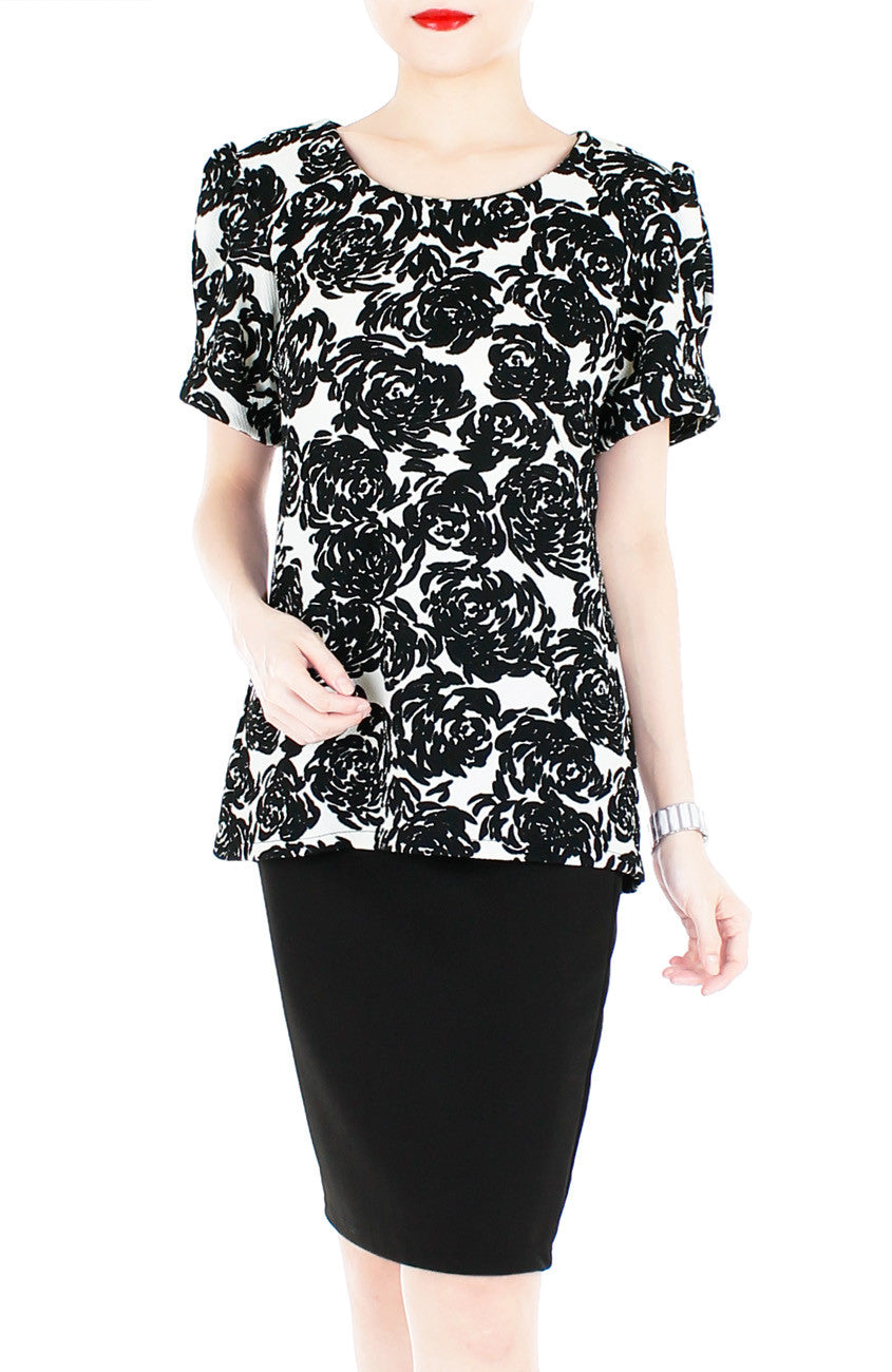 Every fashionista needs pieces in their wardrobe that can be endlessly styled, and this pretty black and white rose blouse promises unlimited options. With short puffy sleeves, this blouse takes your look from casual to classy in an instant! Made from polyester.