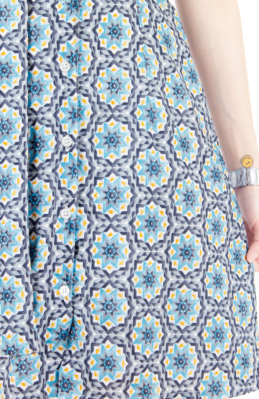 With your luggage bag all packed, and your girlfriends getting together at the airport, this lightweight dress (perfect for the holidays!) is the star of your look and your day is set up to be memorable! Over cocktails in the premium lounge, your girlfriends praise the gorgeous blue Marrakech inspired tile prints of your dress – a smart piece to wear for this fun occasion! Details include: Button down detailing, matching belt, belt loops. Entirely lined. Made from cotton.