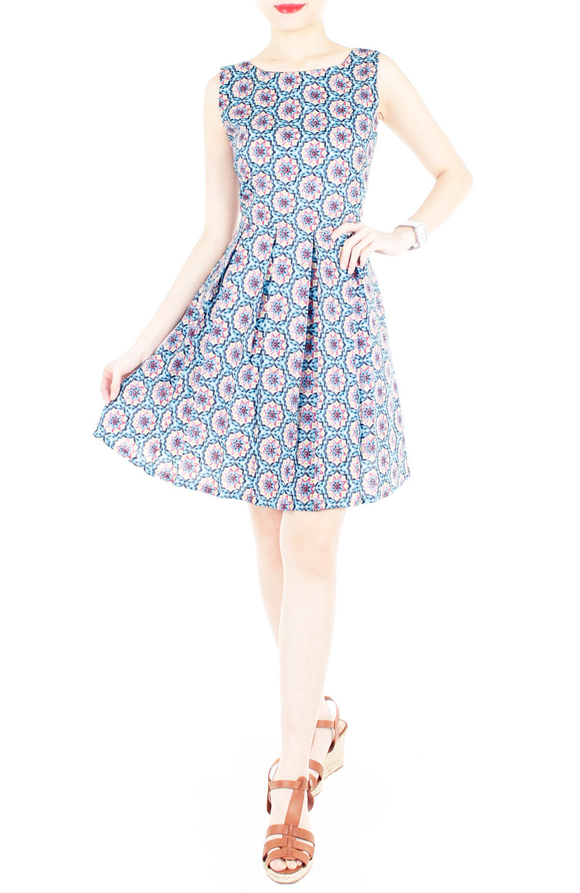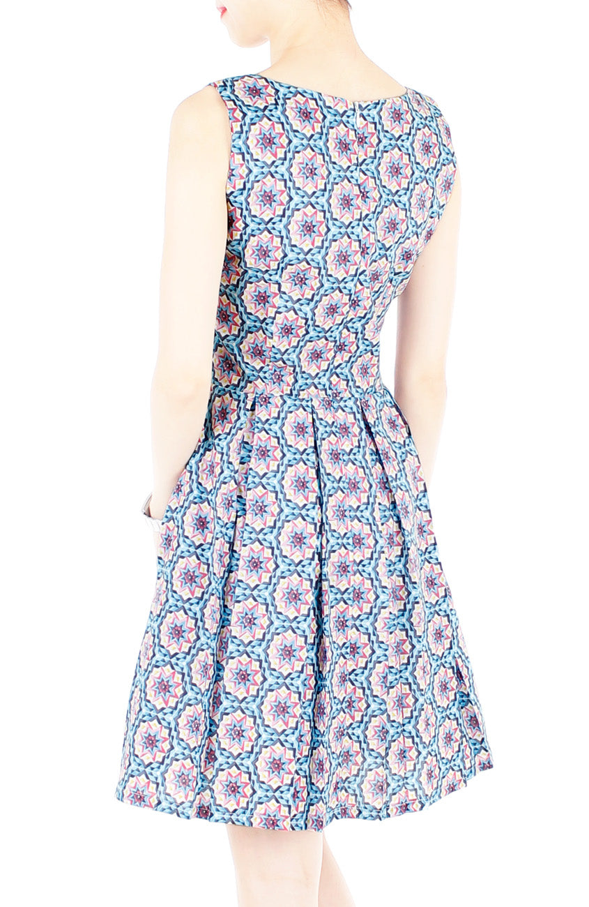 With your luggage bag all packed, and your girlfriends getting together at the airport, this lightweight dress (perfect for the holidays!) is the star of your look and your day is set up to be memorable! Over cocktails in the premium lounge, your girlfriends praise the gorgeous blue Marrakech inspired tile prints of your dress – a smart piece to wear for this fun occasion! Details include: Double layered top, flare skirt with inner lining, side pockets and a hidden back zip. Made from cotton.