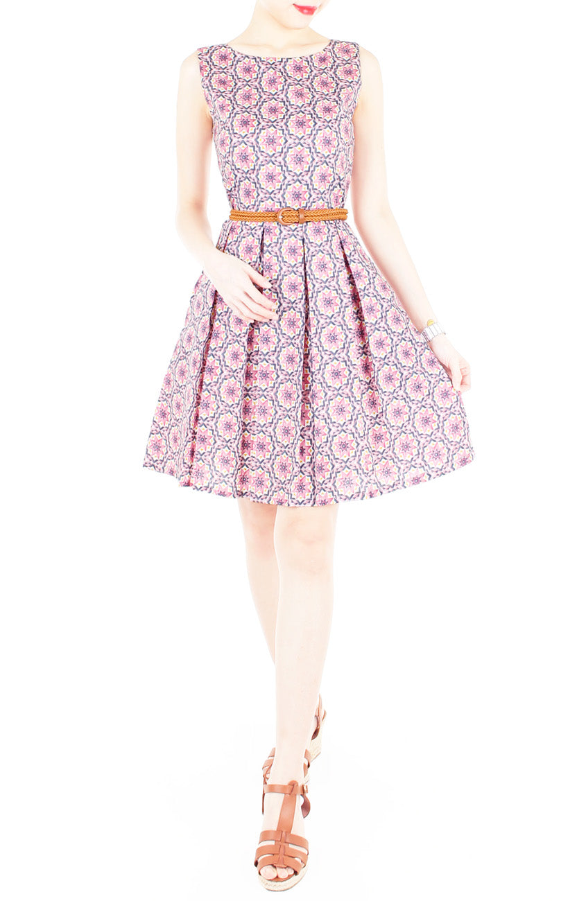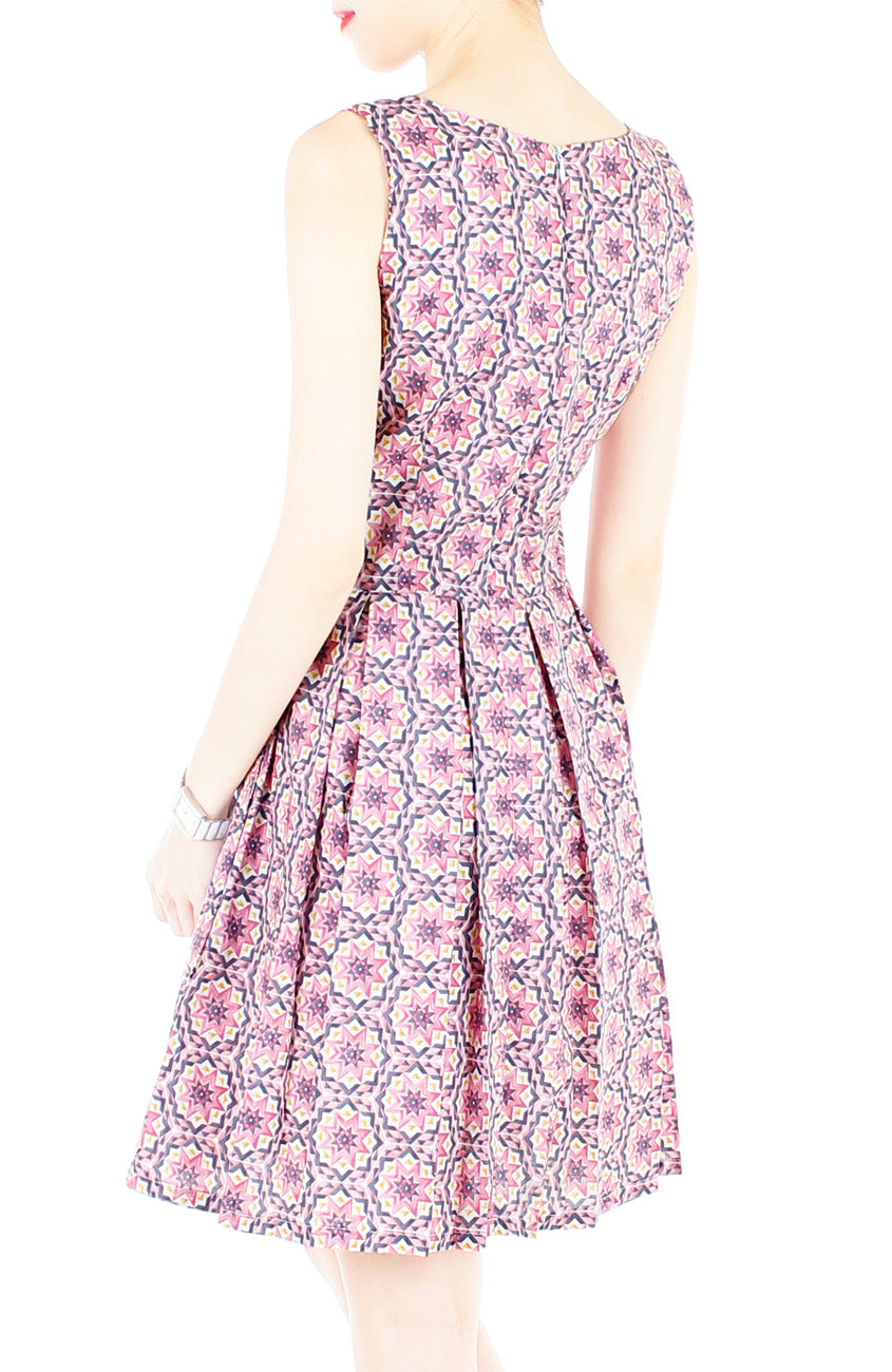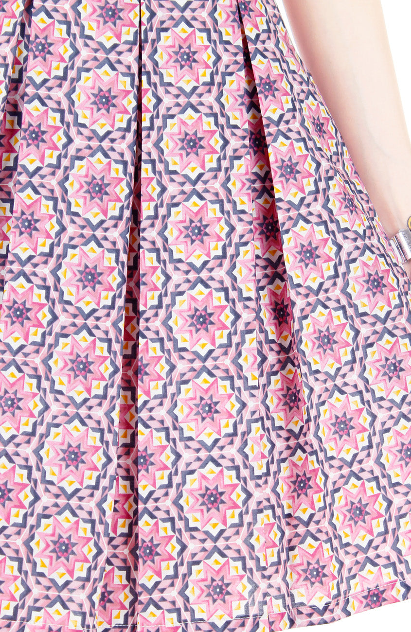 With your luggage bag all packed, and your girlfriends getting together at the airport, this lightweight dress (perfect for the holidays!) is the star of your look and your day is set up to be memorable! Over cocktails in the premium lounge, your girlfriends praise the gorgeous pink Marrakech inspired tile prints of your dress – a smart piece to wear for this fun occasion! Details include: Double layered top, flare skirt with inner lining, side pockets and a hidden back zip. Made from cotton.