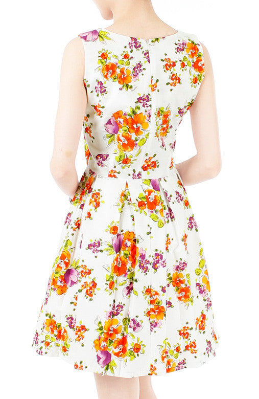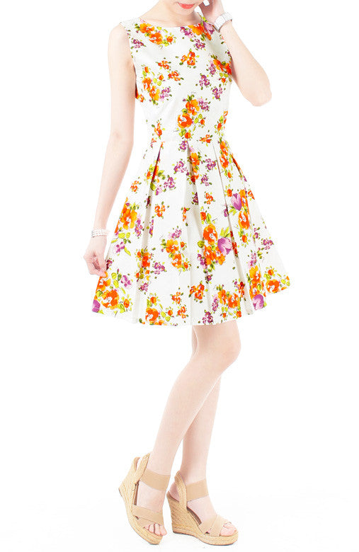 Painting at the national gallery, you’ll need a look that is as bold as your art piece – don this dress, and your masterpiece will be unforgettable! Orange and purple blooms with a crisp white background to create a sassy style that is sure to charm the crowd. Other details include: Double layered top, inner lining and hidden back zip. Made from cotton.