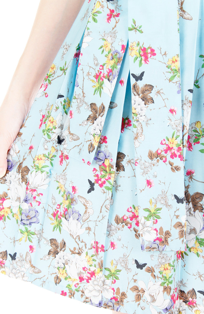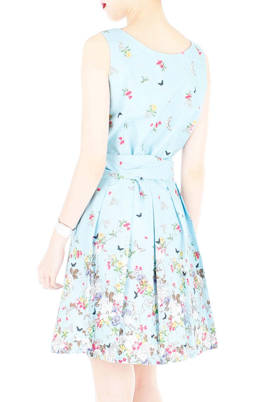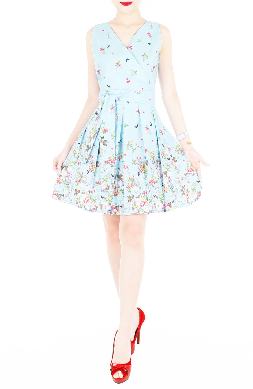 Ah, that familiar pitter-patter of the heart you feel after slipping into this beautiful baby blue butterfly printed dress! With a wrap neck detailing, pleated flare skirt and self-tied waist sash, this dress makes you fall in love over and over again. Other details include: Inner polyester lining, hidden side zip and a matching detachable belt. Made from cotton.