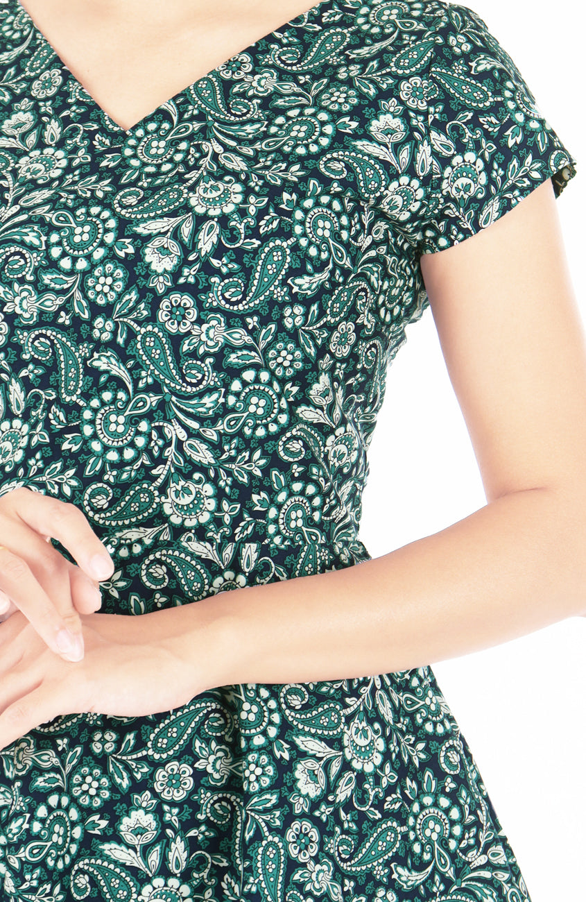 In a motley of rich hues, this flare dress in navy, castleton green and off-white paisley print channels vintage aristocratic sentiments. It’s graceful silhouette and intricate detailing captures a timeless elegance perfect for your occasions!