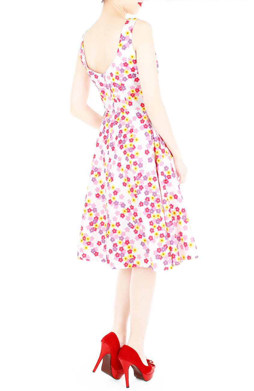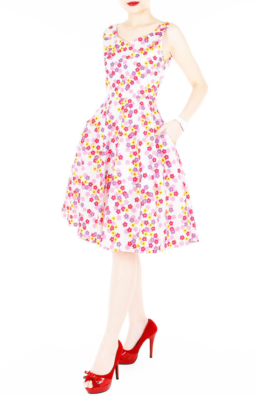 When you’re having as much fun as you will in this brilliant sakura dress in white, the day always goes far too fast! So, savour every second spent in the gorgeous V-neckline and flare skirt – it’ll be midnight before you know it! Other details include: Double layered top, inner polyester lining, side pockets and a hidden back zip. Made from cotton.
