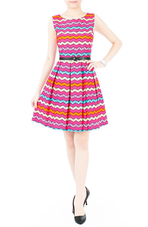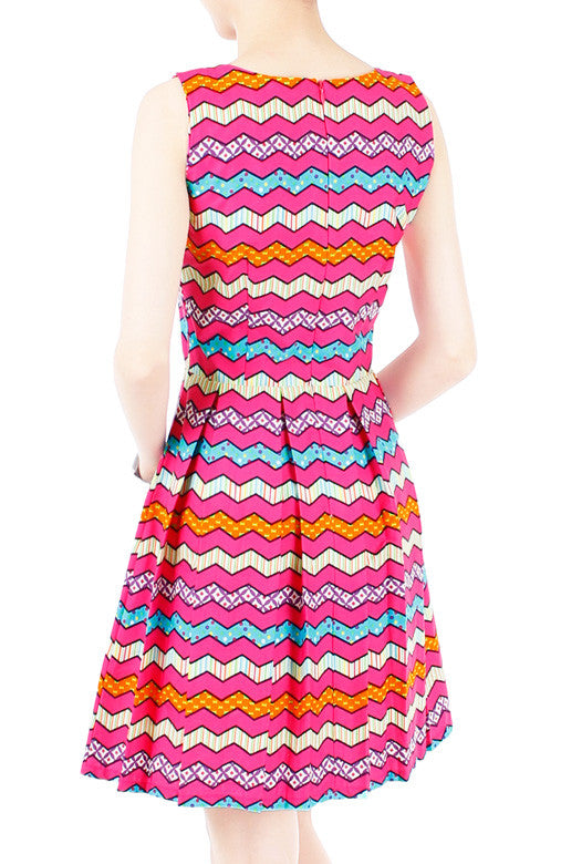 Life your ice lemon tea glass and say a toast to this pretty flare dress! Sporting various prints on a hot pink background, double layered top and a pleated flare skirt, this easy-to-wear dress is a fun one in which to celebrate! Other details include: Inner lining and hidden back zip. Made from cotton.