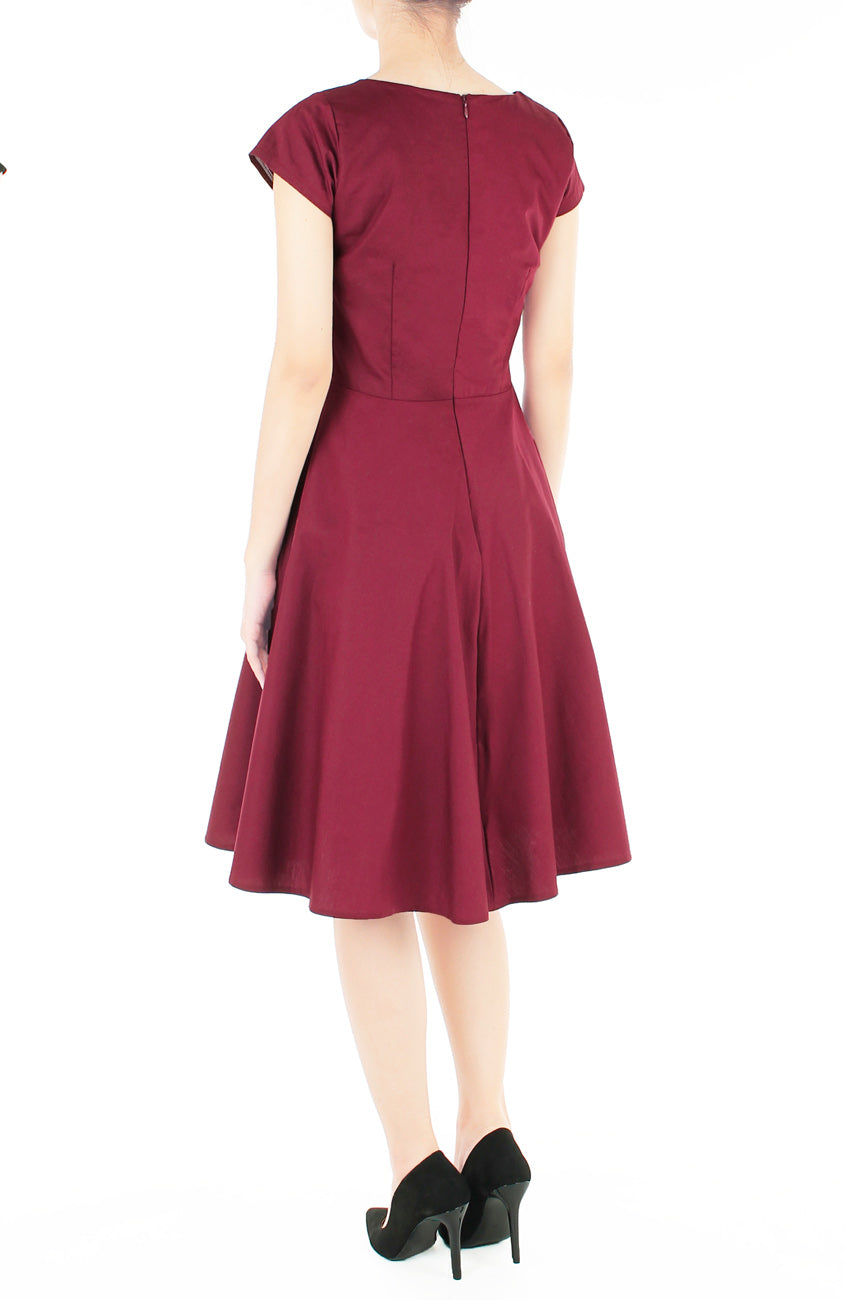This wine red-coloured tea-length dress is as timeless as they come, and has the cutest cap sleeves to prove it too! Designed with a nipped-in waist and a flare skirt with secret side pockets, this classic piece will be your go-to choice for weekend soirees and excursions! Other details include: Double layered top, skirt lining and a concealed back zip. Made from cotton. Styled here with our Contemporary Obi Belt in Red Seigaiha.