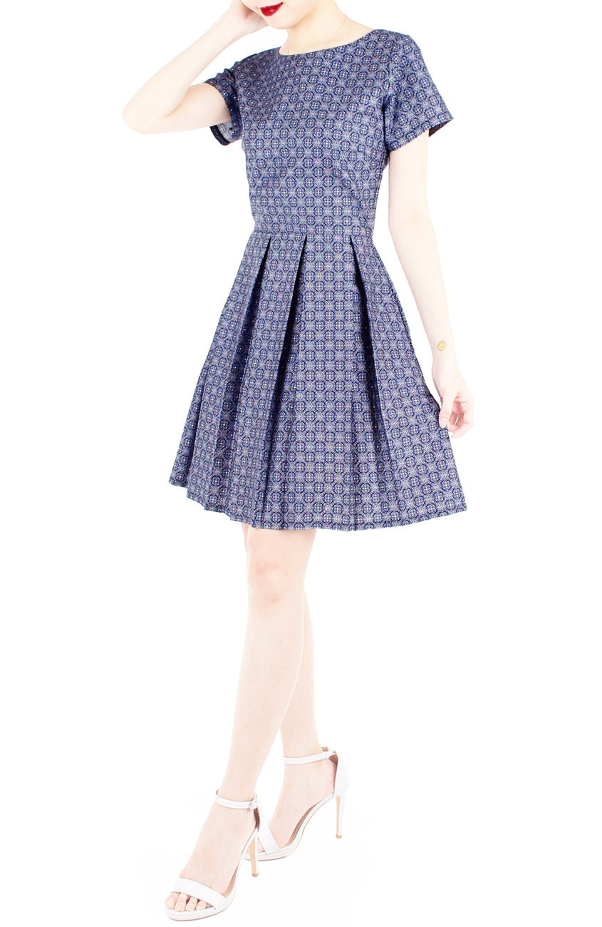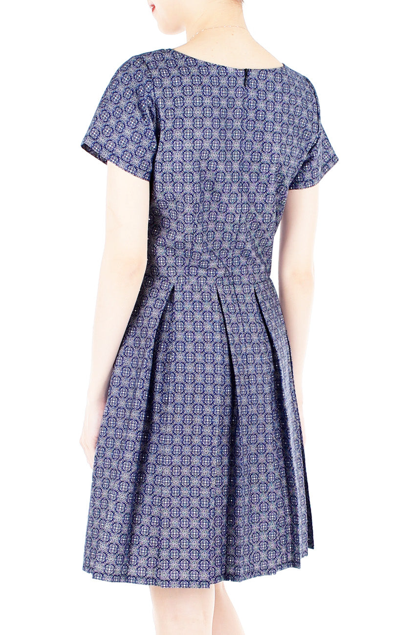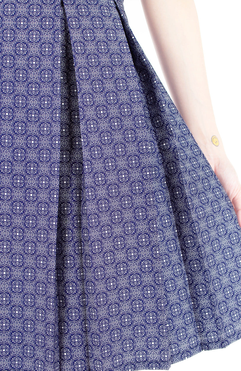 If the notion of skipping town and exploring a new destination in this beautiful Spanish tile printed dress appeals to you, then make that prospect a reality! When you arrive at the new place, slip on espadrille wedges, cat eye sunglasses and a sun hat, then get to adventuring in style! Details include: Double layered top, short sleeves, pleated flare skirt with inner lining, side pockets and a concealed back zip. Made from cotton.