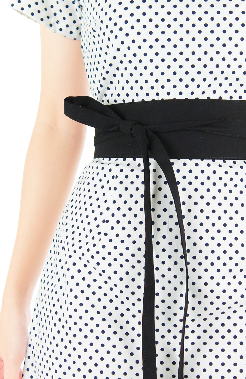 If you need a reminder that simplicity can be sweet and stylish, look no further than this navy and white spotted dress! We love this dress’ short sleeves, nipped-in waist, and a straight cut skirt with hidden side pockets! Plus, its notched neckline adds flair to the dress, making it perfect to take this number to play after work. Other details include: Concealed back zip, double layered top and inner skirt lining. Styled here with our Contemporary Obi Belt in Noir Black. Made from cotton – breathable & machine washable (no colour bleed). Hand wash for initial wash.